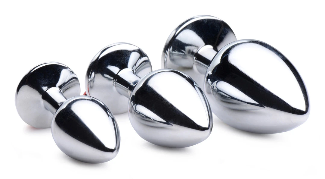 This anal plug set includes three graduated anal plugs, perfect for all skill levels to explore anal play with ease. Tapered and smooth for an easy entry, and made with a nickel-free aluminum alloy for worry free body-safe fill.