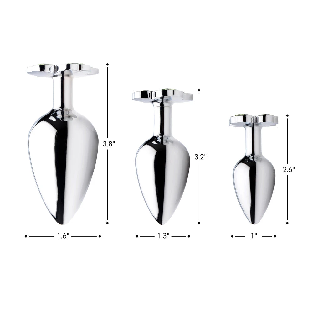 Make that booty get lucky with this petite metal anal plug with a clover jewel design at the base! Pop this lucky charm in your pot-o-gold to appreciate the comfortable weight inside your body, thanks to the nickel-free aluminum alloy material. Great for temperature play, you can warm it or cool it in water before insertion. The attractive shape of the base will surprise your partner when you bend over. Shake that shamrock! Use with any lubricant of your choosing and clean after use with mild soap or toy cleaner.