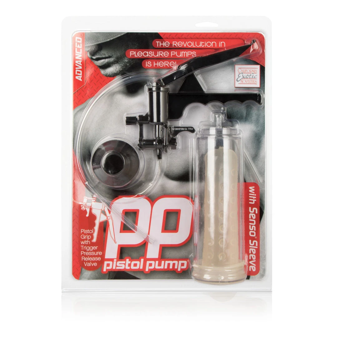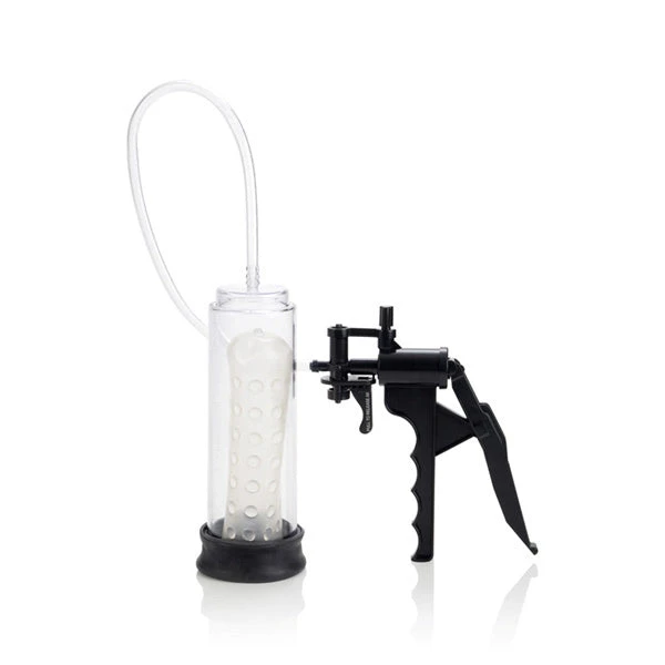 Get ready for a revolution in pleasure pumps! The Pistol Pump with Senso sleeve has an incredibly soft and stretchy sleeve with textured nodules for amazing stimulation. Lube up and slip your shaft into this ultra powerful sucking sensation. Reach your maximum potential with this easy grip pump. Watch your engorged penis grow as it is stimulated by the soft noduled sleeve.