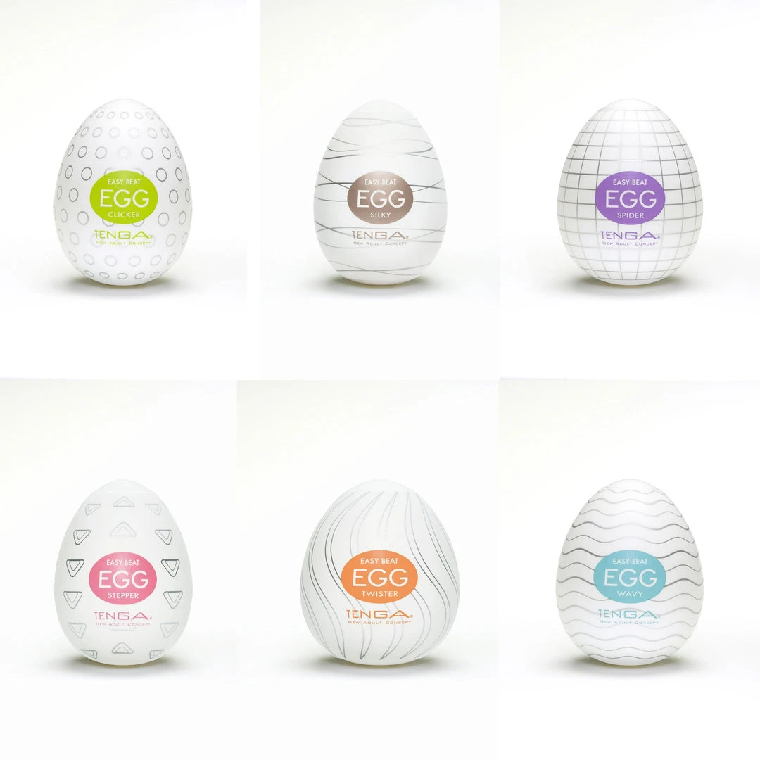 Different Strokes from Different Yolks! The TENGA EGG Series may look small, but their super-stretchable material can fit men of all sizes! The external designs of each EGG reflect the internal details within them! With a total of 6 eggs to choose from, you are sure to find a perfect match! This Variety 6 Pack contains 1 each of the following egg styles: Wavy, Clicker, Spider, Twister, Stepper, Silky.
