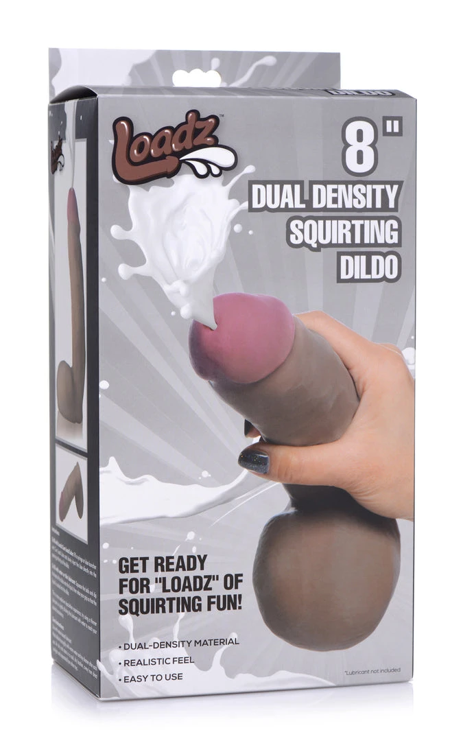 Enjoy a luscious dual density dildo and put on a show for your lover or your fans with this meaty, satisfying, squirting dong! Ejaculation lovers will enjoy the simple squeeze-and-squirt design – use on your lover and cover them with your liquid of choice. Perfect for use with a realistic cum lube, this Dual Density dildo is crafted for the cum hungry!