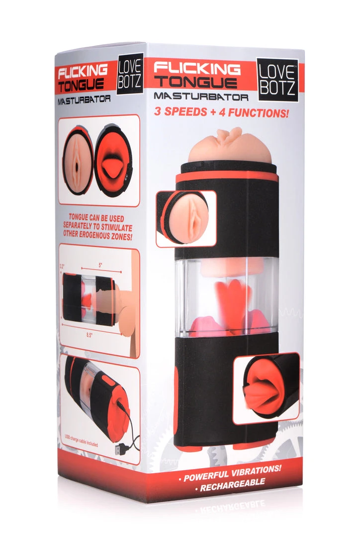 This vibrating masturbation stroker goes beyond fantasy, allowing you to penetrate a vagina and feel a tongue within! Treat your penis to 3 speeds and 4 functions of vibration from the vulva and flickering from the tongue. Just lube up and slip right in! You can even detach the tongue portion to use it separately on other parts of the body. The vulva is made of a soft material that feels ultra-realistic, with texture details within. The silicone tongue is firm but flexible. Experience vaginal and oral sex at the same time with this innovative male masturbator! Use with only water-based lubricants and clean with mild soap or toy cleaner to preserve the materials. A cap is included for easy storage.