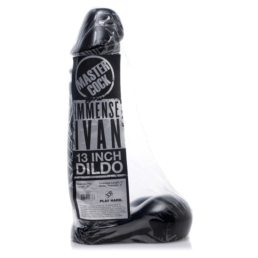 This thrilling black dildo is a full 12.5 inches of ass-stretching glory. The deep black PVC material is perfect for the stiffness needed when pounding such an intimidating specimen of cock. Work your way past the flared cock head, revel in every slick inch of shaft as it slides in, and bottom out at the round, enticing balls. A wide base and pleasing weight keep this immense monster steady as you take it over and over. PVC is the perfect blend of firmness and flexibility, making it ideal for larger toys or ass play.