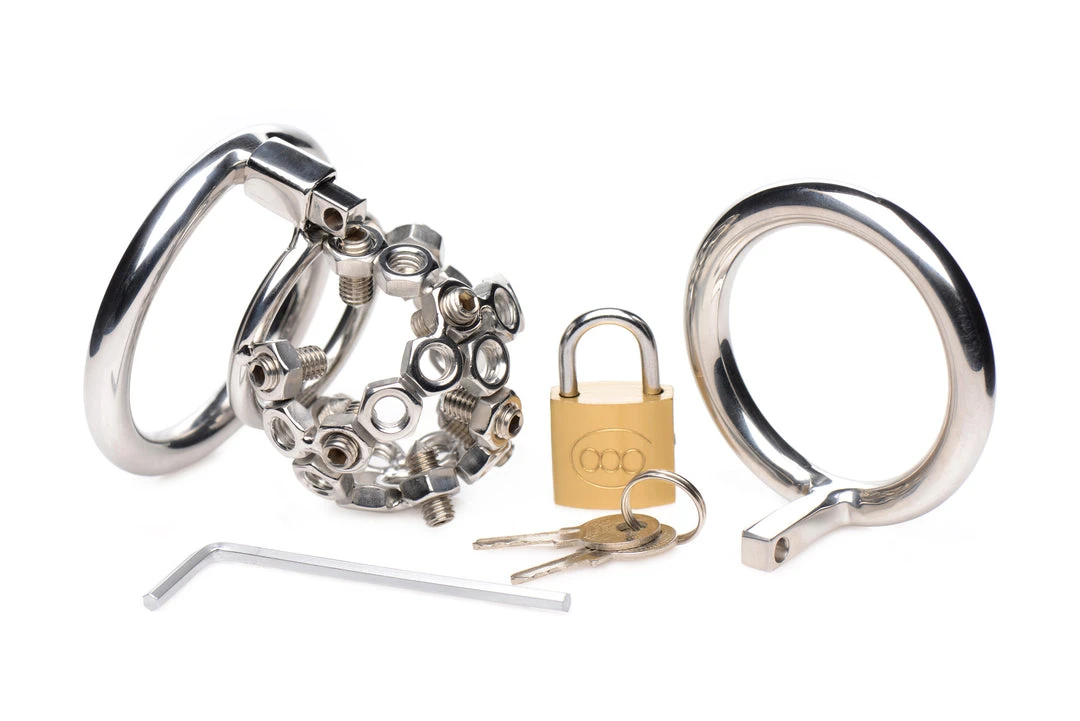 Teach your slave a lesson with a vicious cock cage that reminds them that you can do whatever you want to that pathetic thing between their legs! Not only does this chastity device keep your plaything from achieving an erection, but it also ensures that they are in as much discomfort as you want! Decide how tight you want the device by fitting their whole package with one of the two base rings, then trap their penis with the cage, which is made of hex nuts. Secure the two together with the lock… now comes the fun part! Strategically placed within the cage are 10 screw spikes, which can be taken out and moved around according to your desires. Use the allen wrench to screw them in or out, driving the sharp tips into their flesh as far as you want. This CBT chastity device will remind your partner who the boss is.
