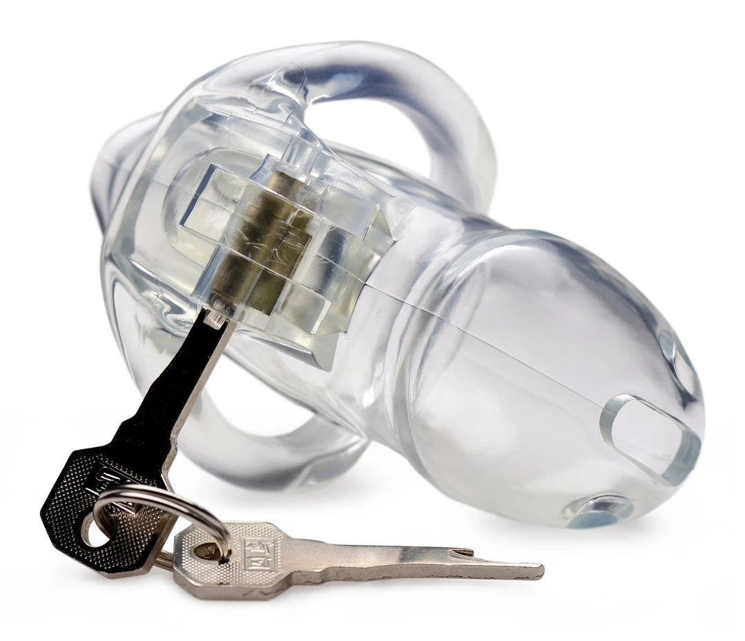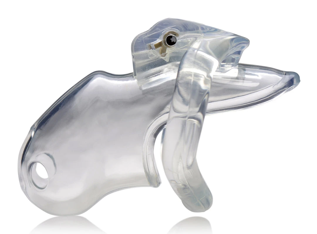 Confine your sub in this clear chastity prison! The Clear Captor locks your partners sexuality in clear view, preventing them from pleasuring themselves until you set them free. Made with forgiving materials for long term comfort, as well as a generous amount of ventilation holes and a pee through tip.