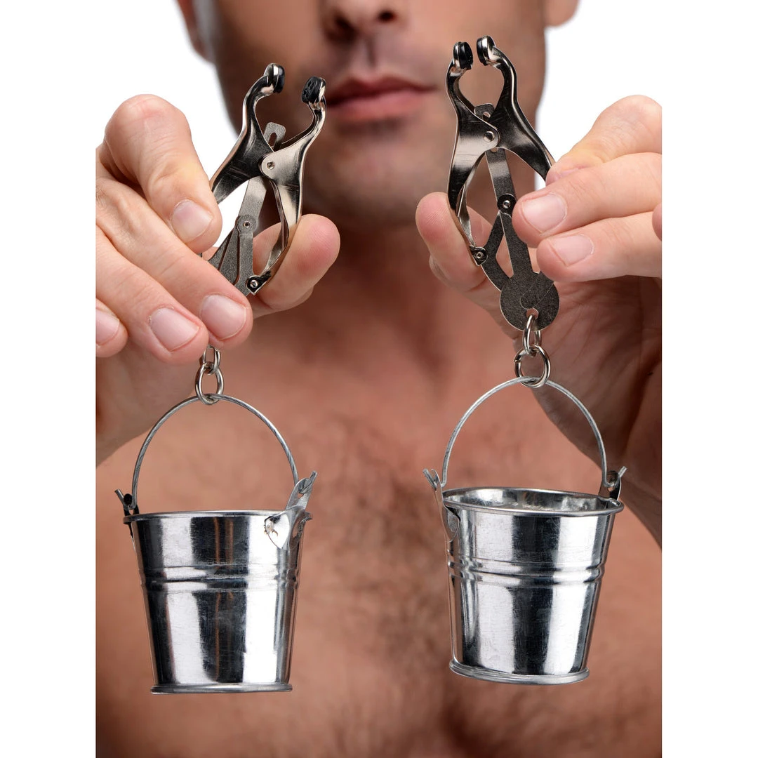 Put your submissive or slave through a unique torment with a set of nipple clamps that allow you to add weight in an unusual way! In the style of butterfly clamps, or clover clamps, these attractive pincers get tighter as they are pulled. Rubber tips ensure that all pain is in the form of pleasure and that they maintain their grip. To add weight, simply fill the small, hanging buckets with water, lube, sand, stones, or whatever your devious mind can come up with. You will love watching your plaything carry the buckets around by their tits!