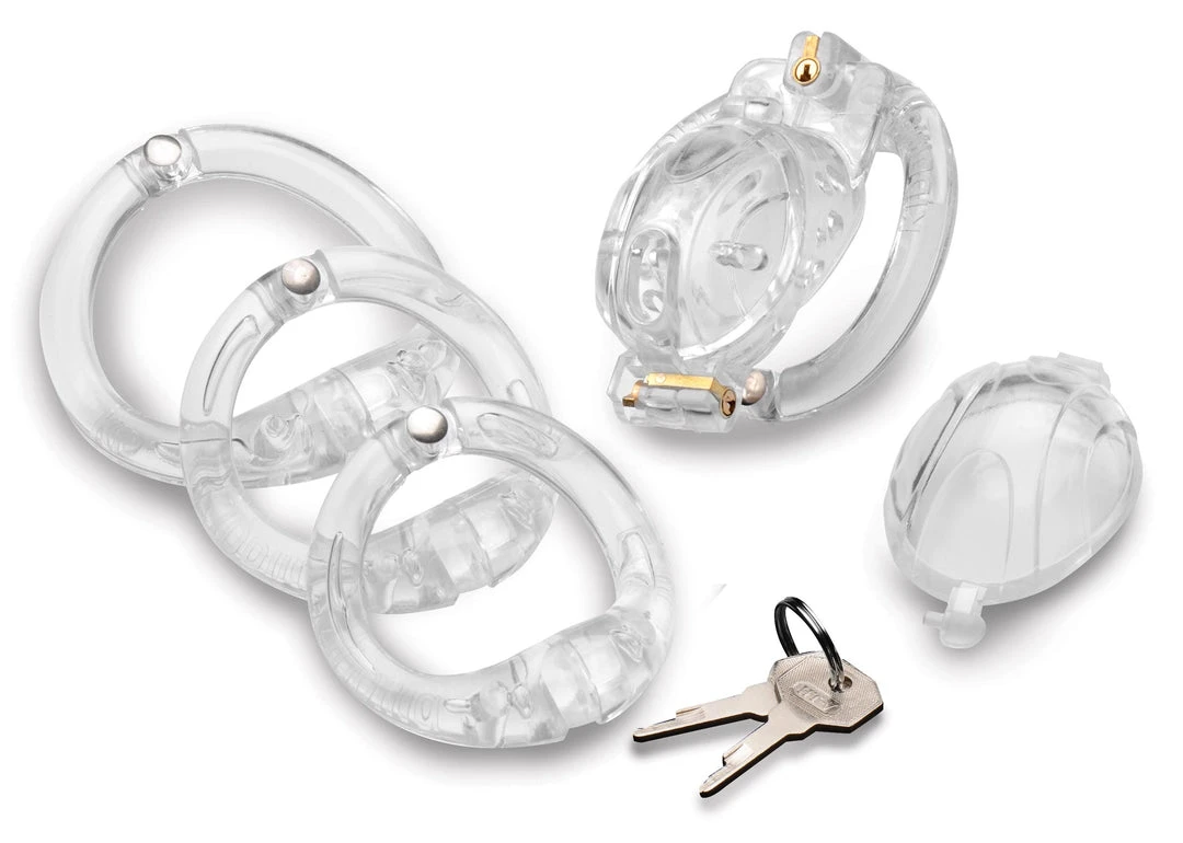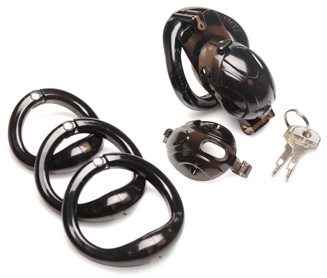 Enjoy the exciting feeling of being locked up! The smooth, hard plastic keeps your member contained and the secure locking system includes two keys and locks the cage in place without the need for a padlock to get in your way during wear. Both the wearer and the keyholder can enjoy the semi-transparent black cage and the captive member within it. Adjust for the perfect fit using one of the 4 graduated rings.
