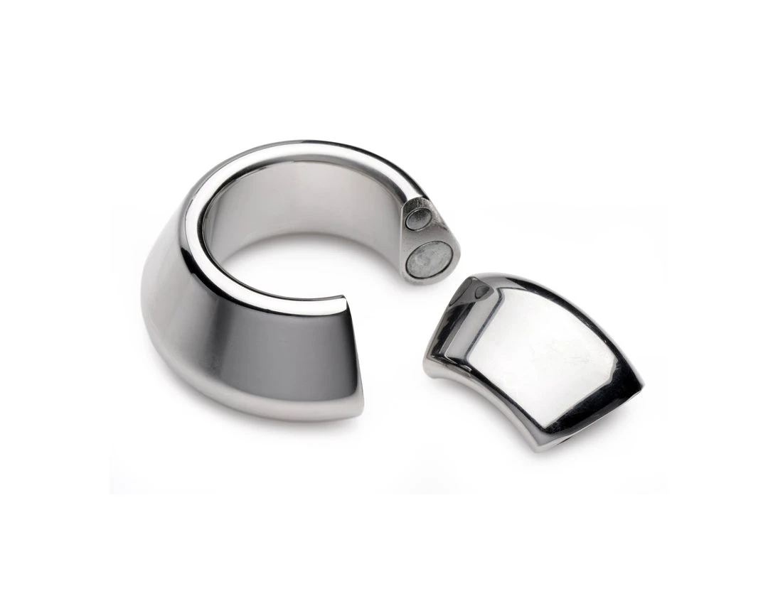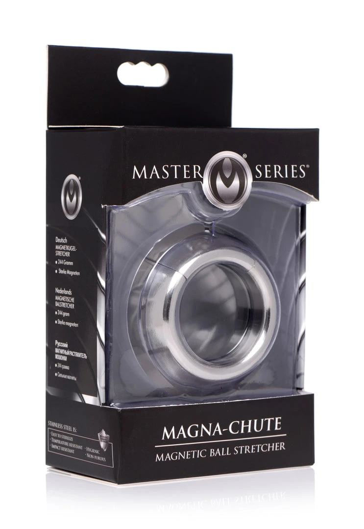 Made of heavy-duty stainless steel, this parachute-style ball stretcher closes with a powerful magnet around your scrotum. Experience 8.6 ounces pulling down on your sensitive balls while you masturbate, have sex, or get teased and tormented by your partner. Gravity will take its toll, creating the tugging sensation you crave and amplifying any sexual experience. The chrome-plated stainless steel is nickel-free, non-porous, and easily sanitized with mild soap or toy cleaner after use.