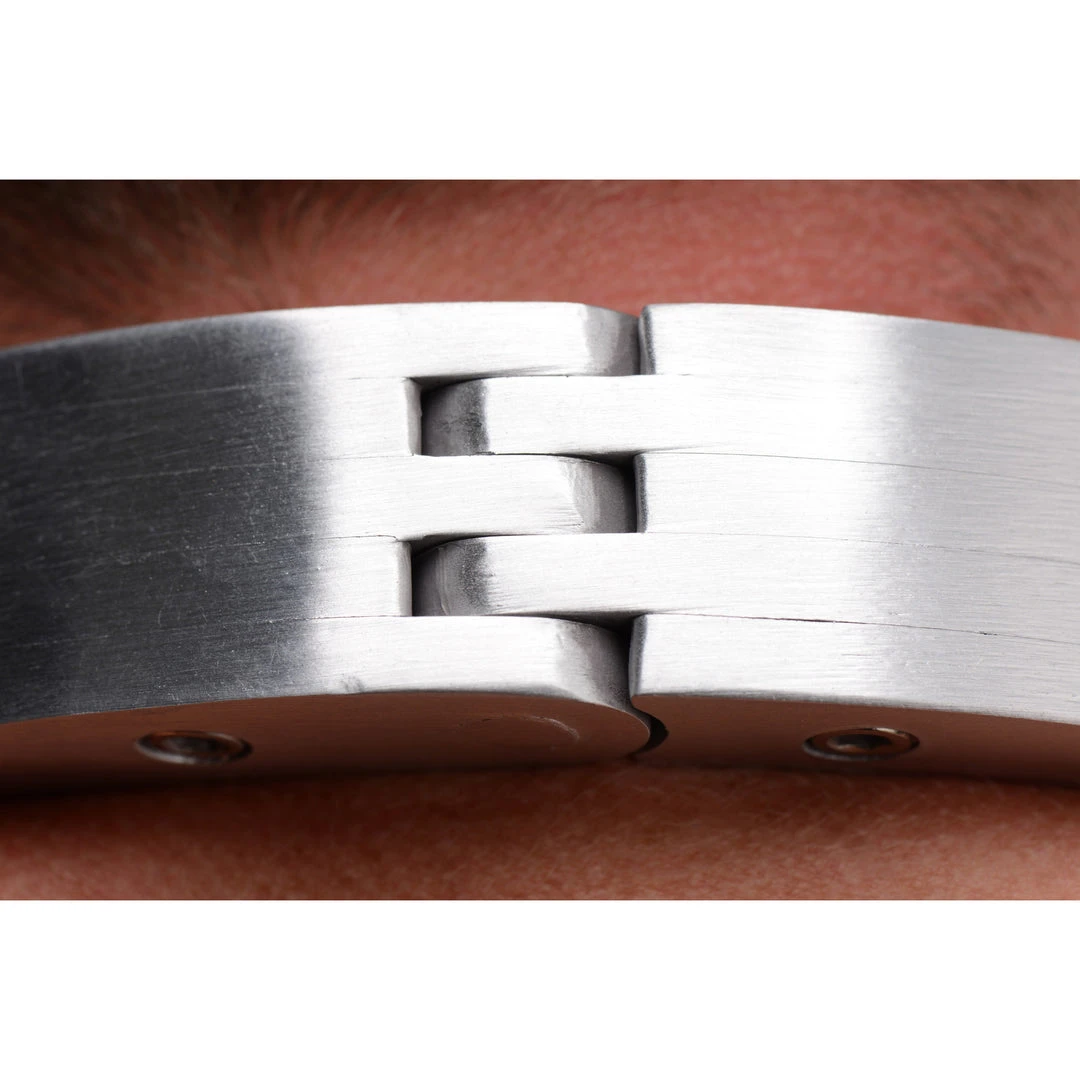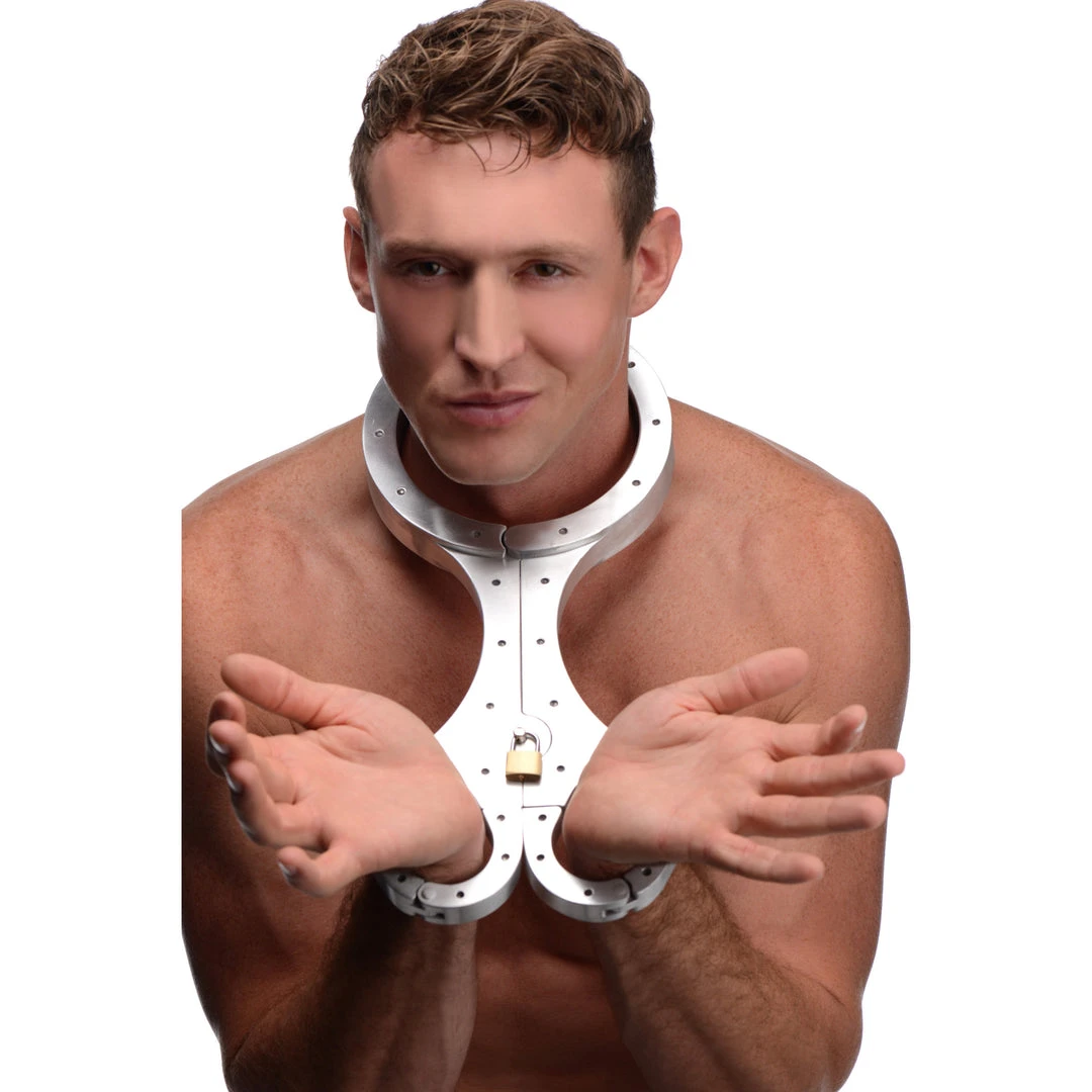 This heavy-duty piece of bondage equipment has a unique design, both in appearance and function. Similar to the restraint used in the film Logan, this restraint keeps your lovers hands immobilized in front of them. A single pin closes this contraption on your playthings neck and wrists. Secure the included lock through the pin to ensure that your partner is fully confined until you have had your way with them. Made of metal, this beautiful and intimidating piece will remind your captive of their place. This device works best on medium to large hands, as smaller hands may be able to escape the restraints.