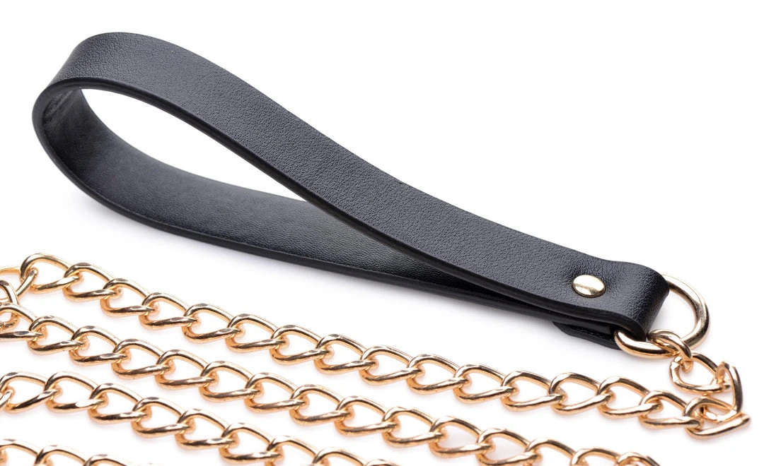 Leash up your sub in style with the included gold chain leash! The black PU leather hand loop matches the dazzling gold metal hardware to provide you a bondage accessory that lets you strut your sub in style around your home or your scene.