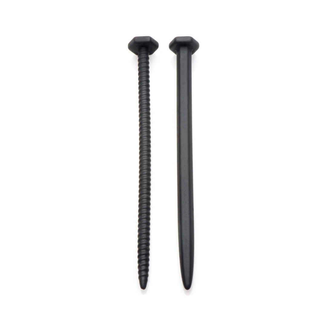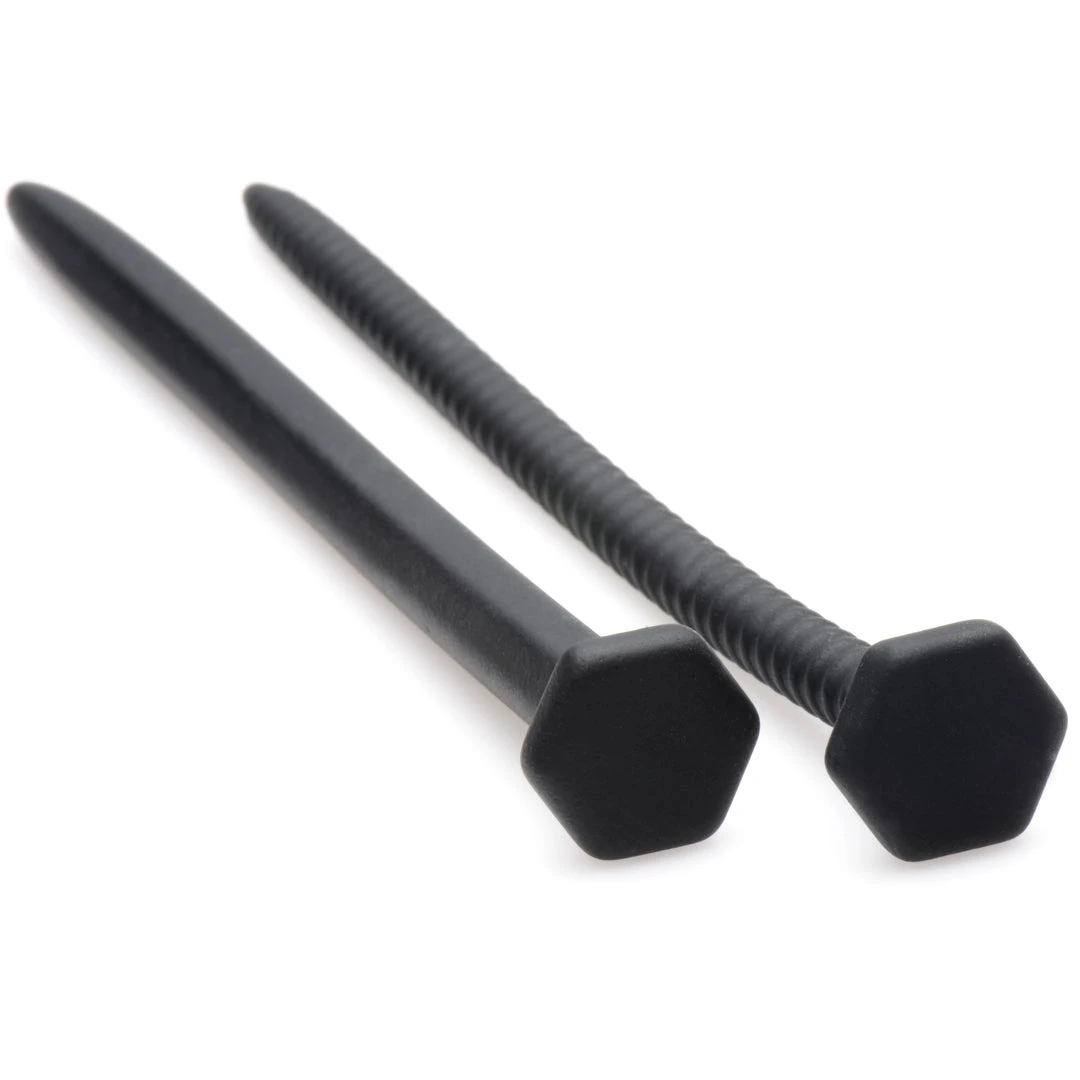 Two irresistible shapes for your penetrative pleasure! Both sounds are shaped like heavy-duty hardware, tempting you with a smooth, hexagonal nail and a spiral-textured screw. The flexibility and silkiness of the material ensures a comfortable insertion as it conforms to your inner curves. Fulfill your most hardcore fantasies with this dastardly duo! Made of premium silicone, these sounding rods are hypoallergenic and easy to clean with mild soap and warm water. Do not use with silicone lubricant.
