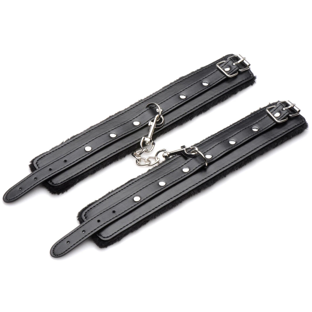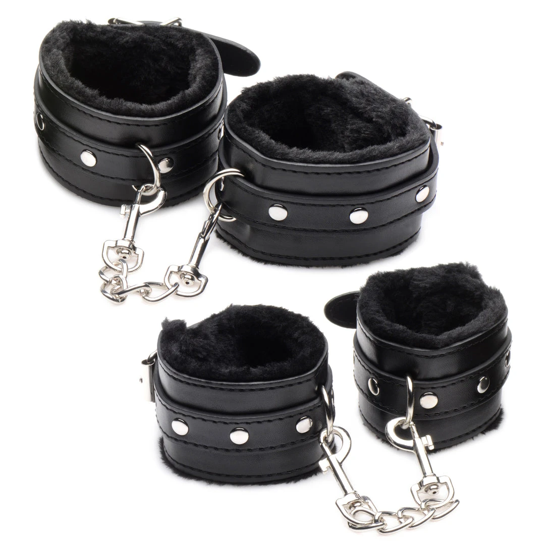 Level up your kinky play with this 10 Piece Plush Bondage set! It has everything you need for a kinky scene plus a few things you’ll want to add for an enhanced experience! The restraint system includes two wrist cuffs, two ankle cuffs, and a collar and leash all of which are vegan-friendly, PU leather. Each of the restraints fastens closed with buckle closures that adjust for comfort, plus each cuff and collar is lined with soft, faux fur! To keep their hands and wrists together, simply use the nickel-free, metal chains that attach to the D-rings on each cuff!