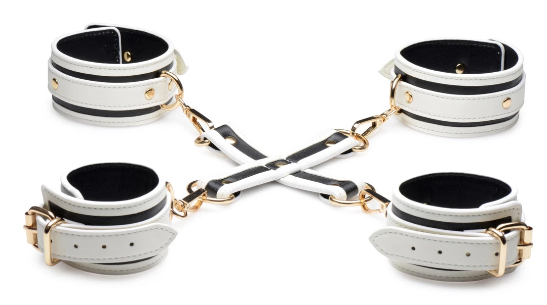Add a kinky glow to your bedroom bondage fun! This Glowing Hog Tie Set makes it easy to tie your lovers limbs behind their back so you can enjoy their body to your hearts content. The white PU Leather and golden metal hardware add an elegant touch!
