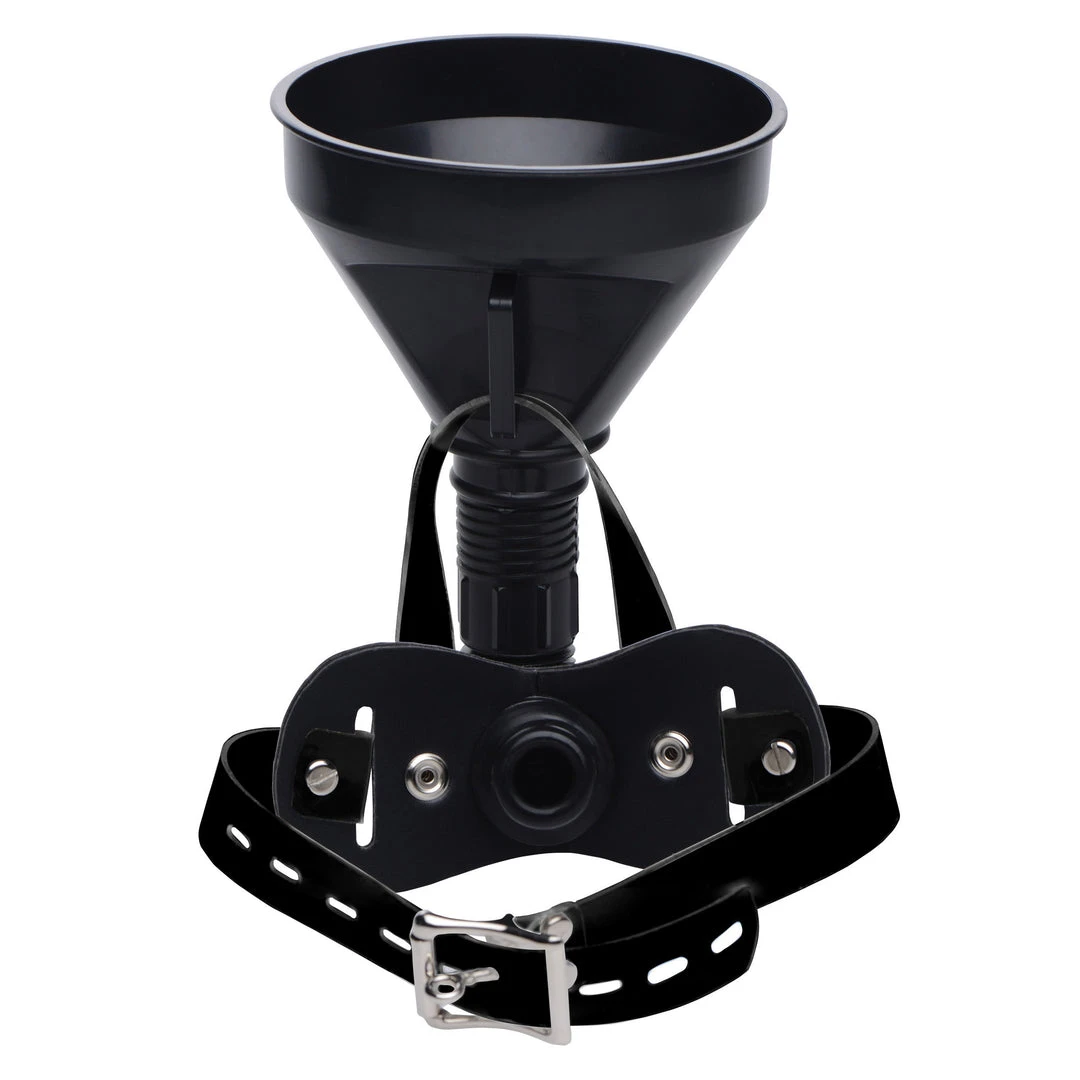 The name says it all! Pour the liquid of your choice down your slaves throat, forcing them to swallow every drop! This innovative and unusual gag adjusts around your submissive lovers head, tightening and even locking so that they cannot escape your twisted desires. The flexible funnel is held upright by a strap that snaps in place, but can be removed so you have more control. The funnel that emerges from the gag allows you to fill your plaything up with whatever you want! Take things up a notch with this sick and sadistic device!