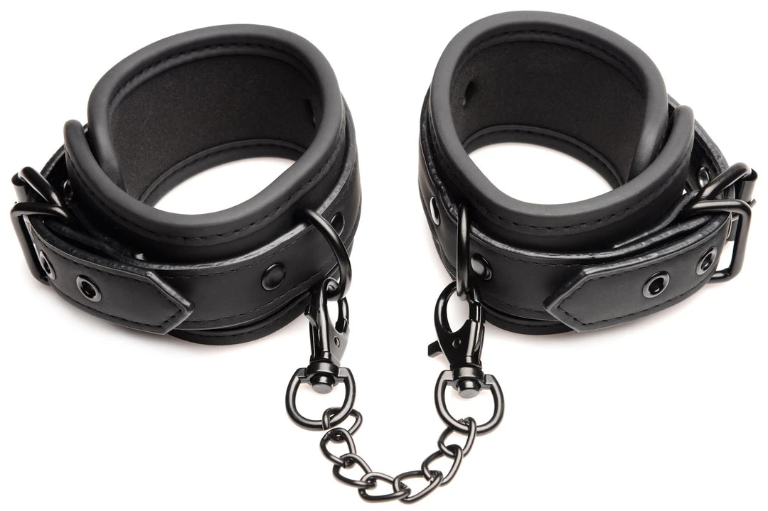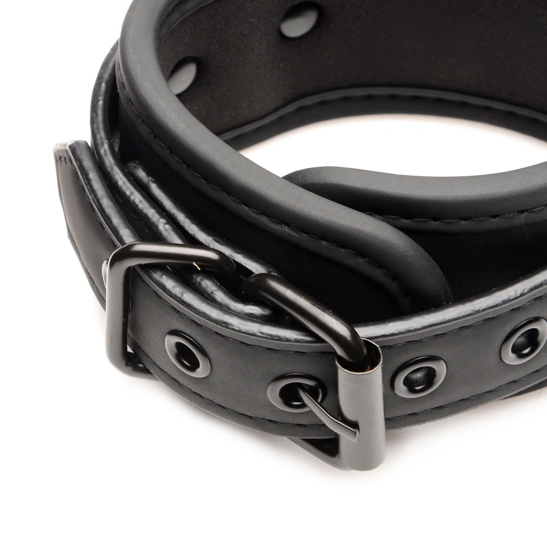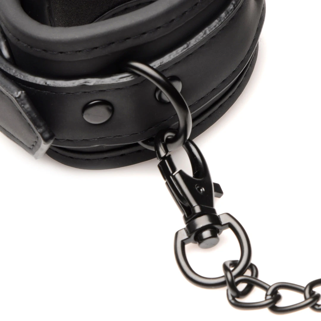 Take your relationship to the next level with this 10 Piece Bondage Set! The set includes wrist cuffs, ankle cuffs and a collar. Enjoy attaching the nickel-free, metal chains to each of the cuffs to bind them, and then attach the metal chain leash to their collar to lead them around! The straps on all of the cuffs and the collar are made of vegan-friendly, comfortable PU leather and are easy to adjust using the buckle closure. Add some more fun into your evening with more goodies included! This kit also introduces you to sensation play and light impact play! Enjoy trying out the flogger or paddle on their backside or lightly against their chest while they are blindfolded and gagged. Use the blindfold to enhance their sensitivity and awareness to touch. Use mouth gag has holes in it to improve breathability and can also enhance your sexual experience!