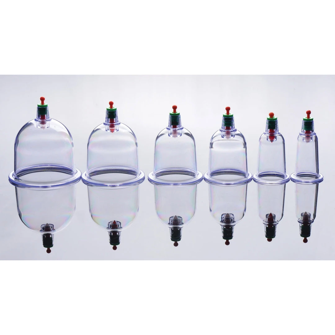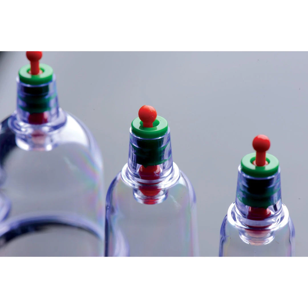 Directly stimulate just about any spot on your body with an easy-to-use cupping set. With six cups in graduated sizes, you can experiment with powerful suction and increased sensitivity! Stemming from Chinese medicine, this unique method of relieving sore and aching muscles also makes for an erotic massage, intense BDSM play, or an exciting exploration of self-pleasure. Simply place one or more cups directly onto the skin, creating a strong seal, and attach the handheld pump to the green and red tip of the cup. Pull the pump trigger to create suction, working towards your comfort level. Lubricate the skin first in order to slide the cups around for different sensations. The pump may be detached and the cups will still remain attached to the skin by the vacuum. Acu-Points centered at the top of the cups provide additional stimulation against the skin, should you choose to pump that far. When you are finished, the pressure released easily by pressing on the red tip.