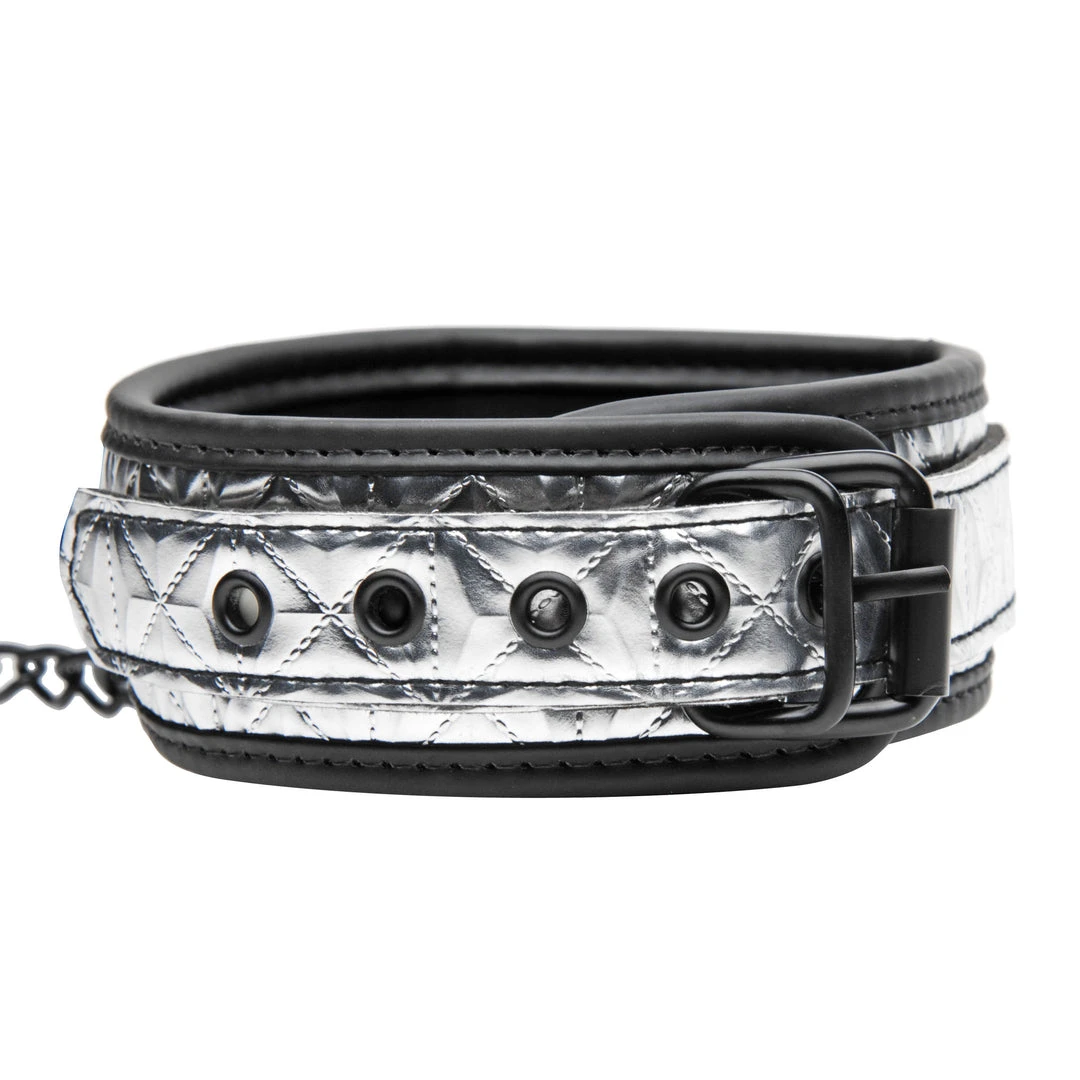Allow yourself the freedom of relinquishing control with the Platinum Bound Leash and Collar Set from the Master Series. The collar features a sleek and sexy embossed outer design, comfortable padded Neoprene lining, and black, nickel-free hardware. Fully adjustable via the simple, belt-style enclosure and connected to a devious thirty inch removable black metal chain, topped with a leather strap.