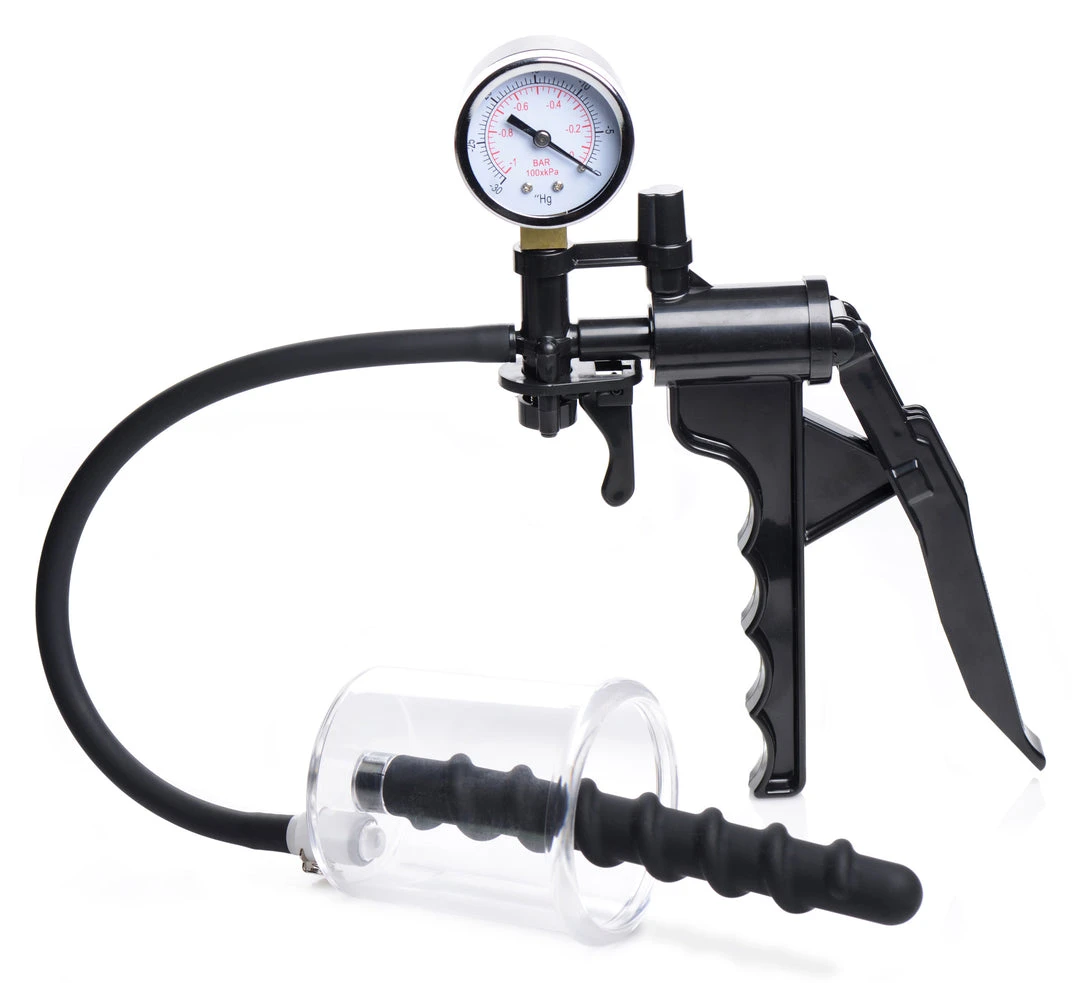 Screw the rod into your ass until the cylinder creates a seal around your hole! Attach your hose and pump and squeeze to increase circulation, making your tight little ring swollen and sensitive. Anal engorgement combines with penetration in this unique pumping accessory. Your anus will be sucked in, puckering out like a blooming rosebud! The swirling ridge on the anal shaft will add additional stimulation as you increase the size and sensitivity of your hole, but it can also be removed for use without. Both materials are non-porous, durable, and sanitize thoroughly with mild soap or toy cleaner. Avoid use with silicone lubricants.