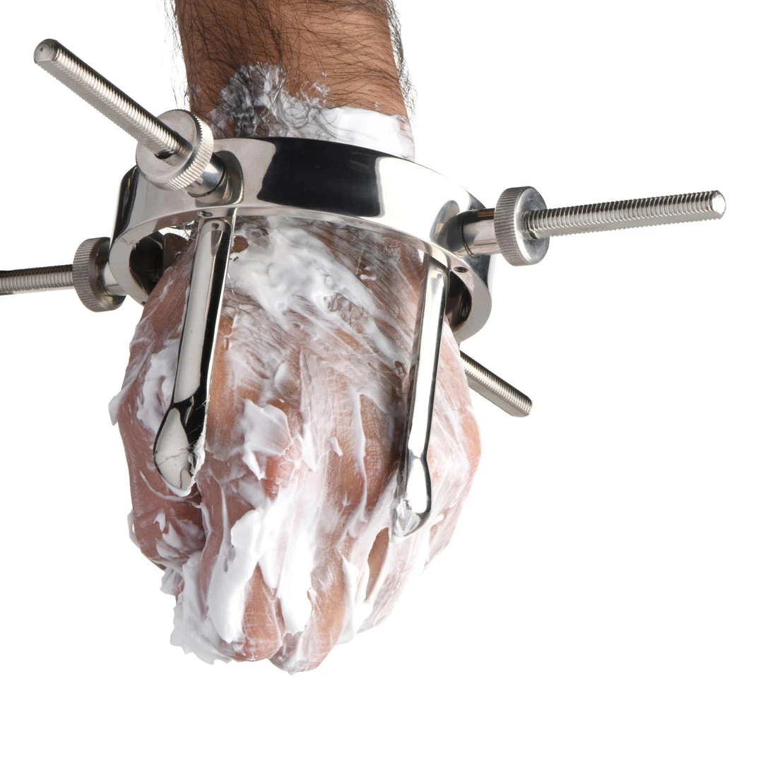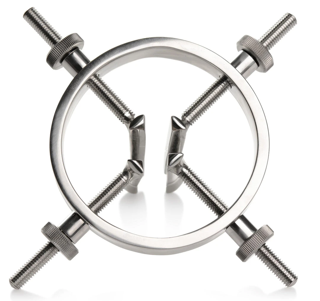 Indulge in a medical fetish or prep for deep and wide anal play! This Anal Expander is made of steel, so it is durable, strong, non-porous and built to last! Compatible with any lube type, it’s perfect for deep, intense penetration and stretching. The center ring is 4 inches wide which allows enough space for most fists to penetrate through. To expand, simply twist the nuts on each of the 4 screws until it reaches your desired expansion level. The dilators will open the anal sphincter so you can easily see inside or insert other body-safe, flanged objects or lubricants.