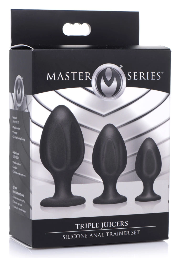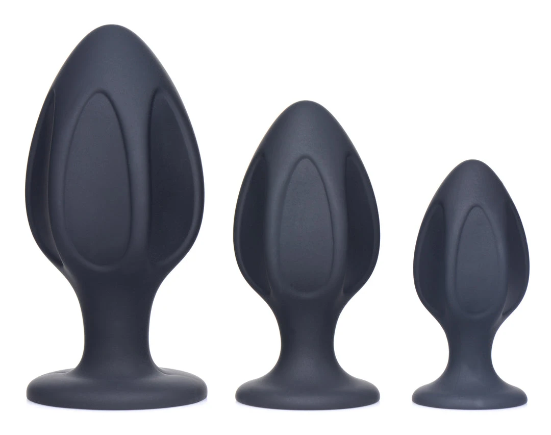 Three juicy anal plugs for all levels of backdoor play! Uniquely shaped for a provocative fill – the star shaped body provides high peaks and deep valleys for your backdoor to squeeze and enjoy. The cushy and squeezable silicone body provides an addicting fill, while the graduated sizing from small to large makes this trio perfect for all skill levels.