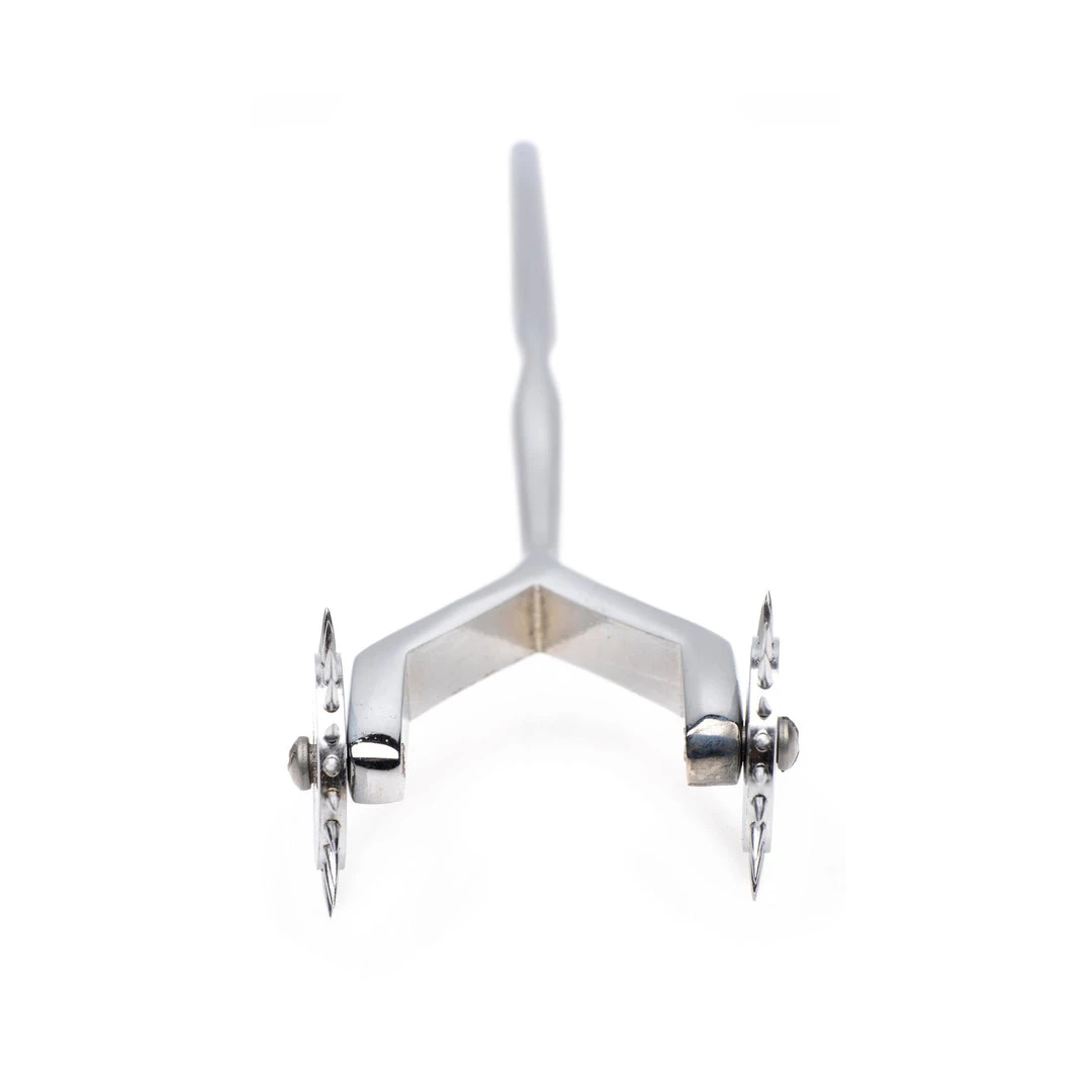 This attractive and exciting take on a Wartenberg Wheel is made of heavy-duty stainless steel, with two spinning heads to tease and please your lover with. The handle is slightly indented on either side for a comfortable and secure grip between your fingers during use. Glide the instrument across your partners chest or up their thigh to send shivers through their whole body. The wheels spin smoothly, sharp pin-pricks leaving a trail of sensation in their wake.