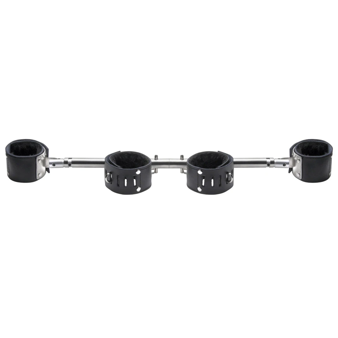 Secure their wrists and ankles and grant yourself unrestricted access to their mouth with this simple yet highly effective bondage kit. The cuffs are secured permanently to the bar, with swiveling hinges and a secure build. The leather wrapped ring gag fits behind their teeth, holding their mouth open and exposing them completely to you. The adjustable leather strap has a sliding D-ring closure, for a secure fit on every size.