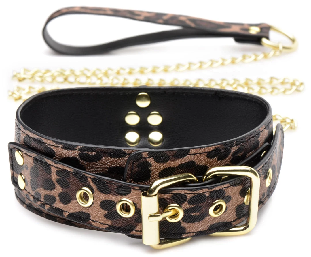 The wrist cuffs, ankle cuffs, collar, and mask feature a striking jaguar print to show off your inner hunter! Fully adjustable to fit most body shapes, these vegan friendly faux leather bindings can be customized to fit your type of playstyle. The included connecting chains allow you to indulge in timeless bondage fun, while the leash ups your role-play to the next level!