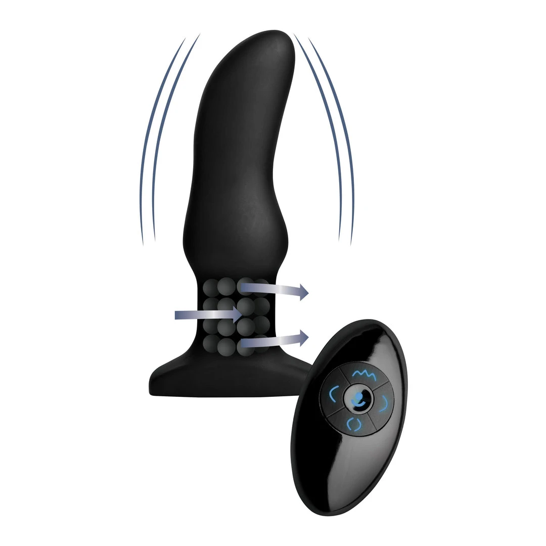 Curved to target the P-spot or, in women, to reach towards the G-spot, this anal massager also features a bulging bulb for your inner pleasure! Better than your average butt plug, this revolutionary sex toy will actually massage the opening to your hole with rotating beads along its stem, providing a sensation similar to a rim job! Play with 3 speeds and 2 functions of swirling satisfaction around your sphincter. You will also be treated to 3 speeds and 5 patterns of vibration as the plug thrums inside you. An optional remote control can make playing on your own easier, but it can also provide wireless fun with a partner. Light up buttons on the remote and the plug make them easy to see in the dark. Made of premium silicone, this exciting tool is non-porous, phthalate-free, and waterproof for a body-safe experience and thorough sanitization with soap and water.