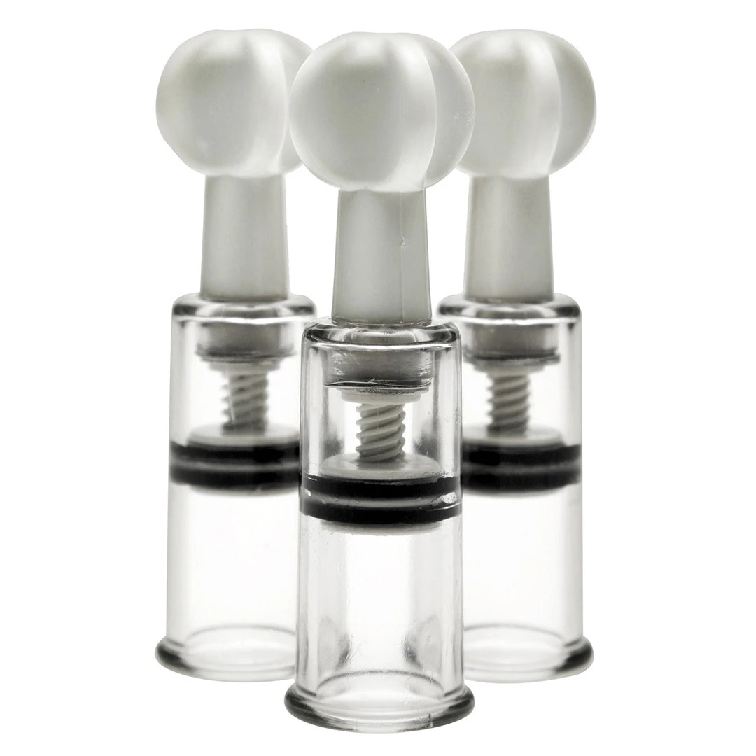 Enjoy powerful suction with this triple set of demurely sized suction cylinders. Just apply to any area that would benefit from increased sensitivity and blood flow, no pumps or accessories needed. These self-contained suction devices work with a simple twist. Silent, simple, and discreet, these suckers can be taken and used practically anyway for on the go stimulation. Lubed internally for smooth movement and a strong seal that makes for sublimely powerful suction.