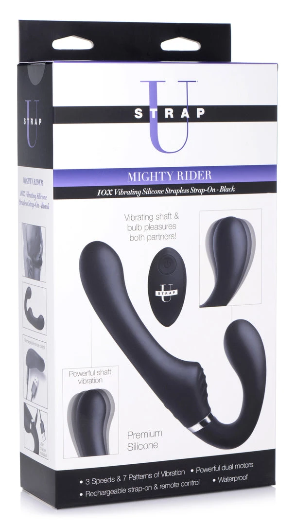 Equip yourself with this velvety, double ended strapless strap-on! Insert the vaginal bulb and hold up the Mighty Riders phallic shaft without a harness so you can peg and penetrate in complete freedom. Featuring powerful vibration, a waterproof build, and a wireless remote controller for the ultimate hassle free strap on experience!