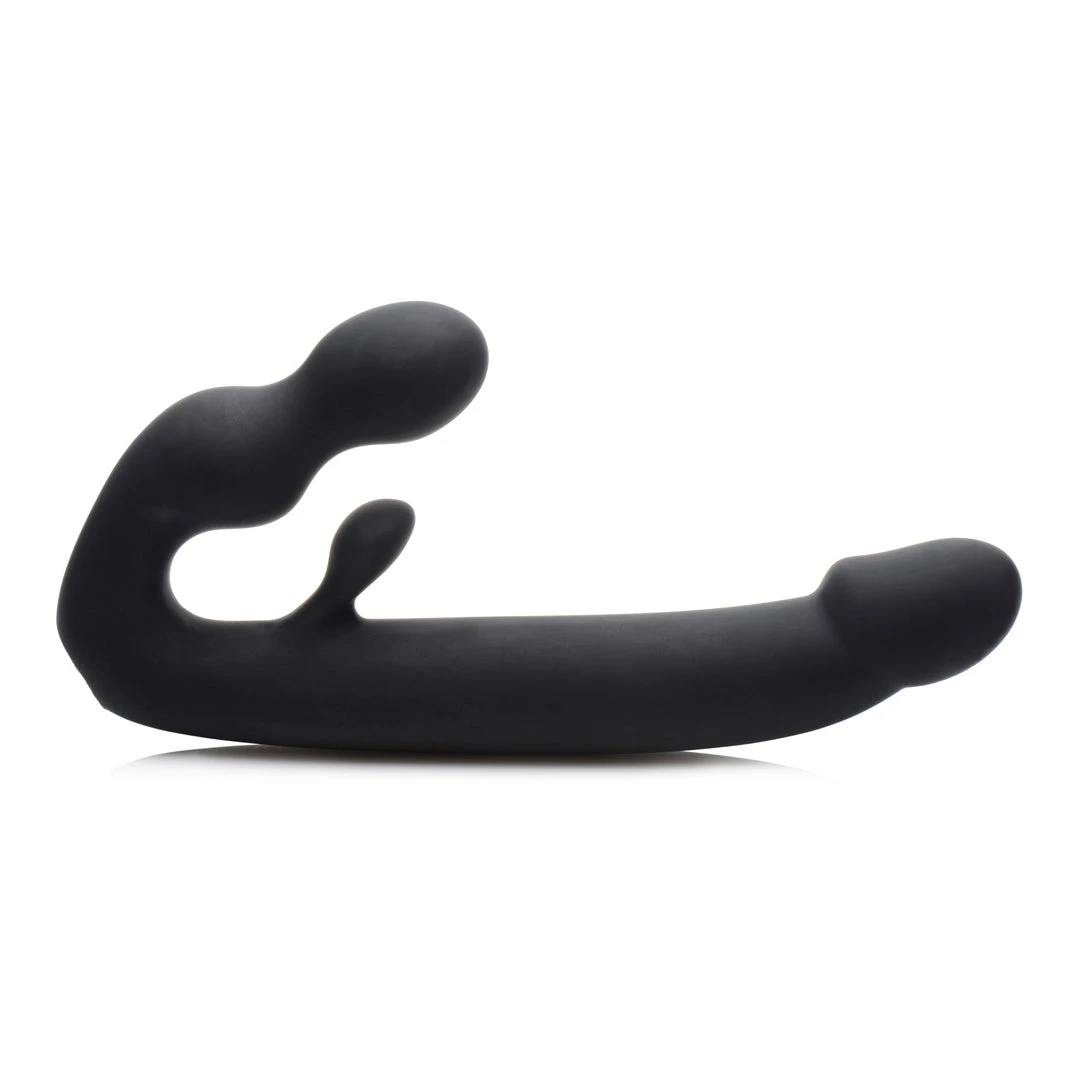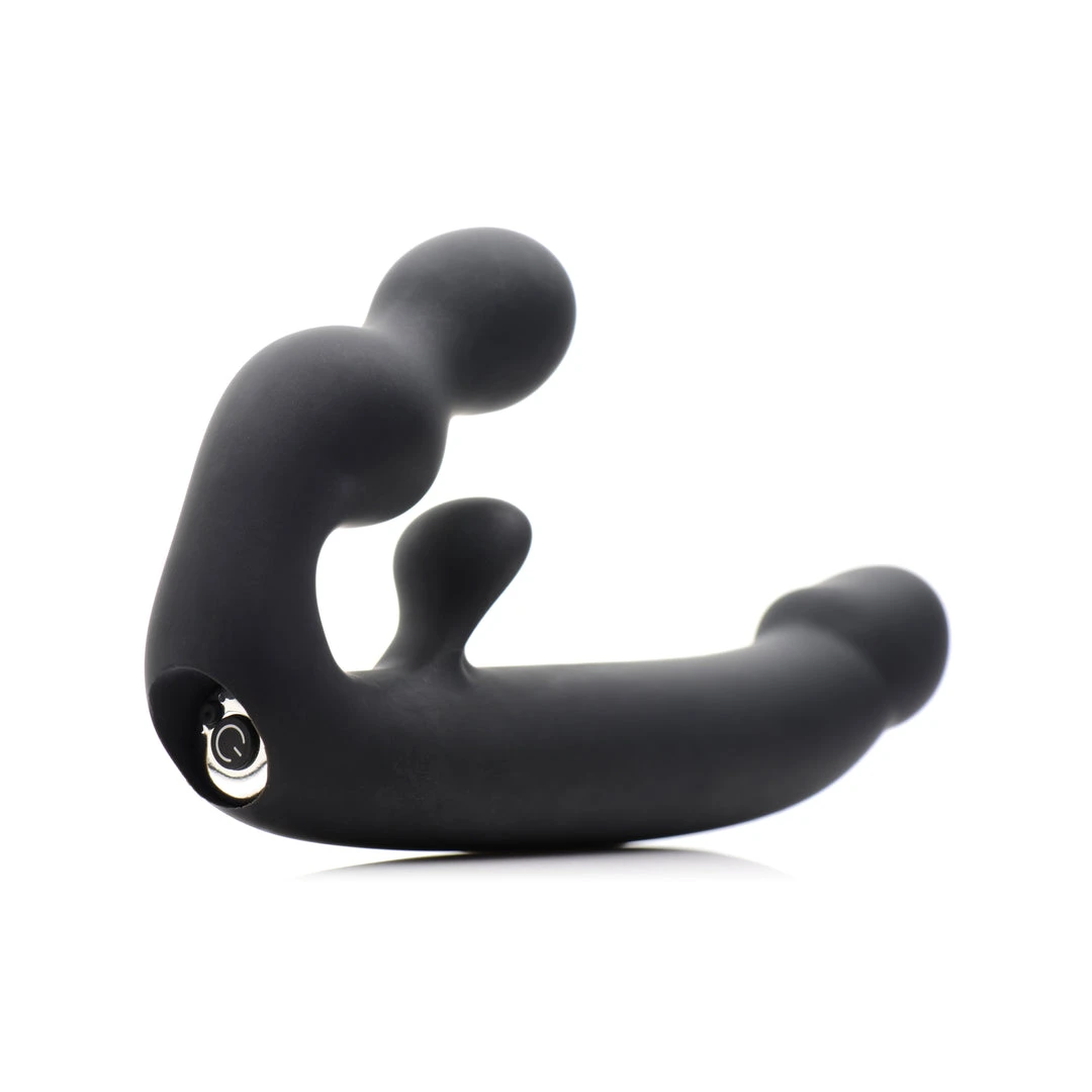 Both partners receive powerful pulsating pleasure from this double-sided strapless strap-on. A slender shaft, clitoral stem, dual bulbs for the wearer, and 7 incredible modes of vibration set this beautiful strapless strap-on apart! This rechargeable pleasure tool features dual motors to provide you with 3 speeds and 4 patterns of powerful internal thrumming. The single control button is easy-to-use and accessible during penetration. Both ends of this artfully designed double dildo are shaped for the ultimate in ecstasy: the smaller end features two smooth swells while a protruding stem massages the clitoris. Meanwhile your partner will be treated to a narrow, comfortable shaft with a bold coronal ridge. It is even waterproof so that you can take your play into the shower, bath, pool, and more! Explore greater intimacy with a vibrating double-ended strapon dildo. Made of silky silicone, the Tri-Volver is non-porous and phthalate-free. Clean with mild soap and warm water and avoid use with silicone lubricants.