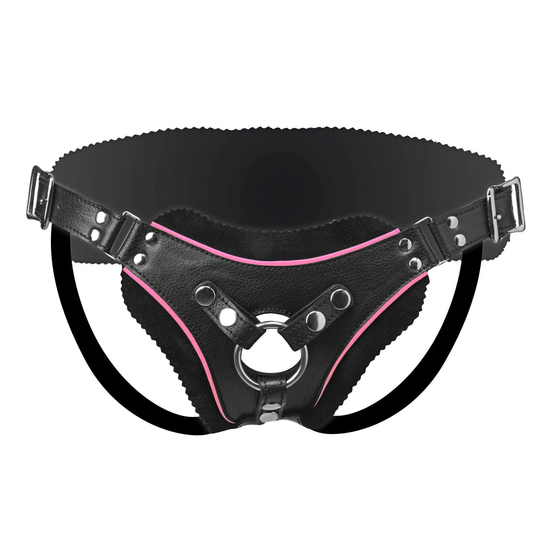 This vegan-friendly strap on harness has exciting pink accents and a low-cut designed to help draw their eye and keep their attention fixed on you. The belt is fully adjustable, with buckles at the hips and rear straps for a tight fit. The back is wide for more support, and lined with soft fabric for comfort. The front has an easy snap-in feature. Using one of the two included steel O-rings, you can add your favorite dildo, with multiple size options. The open-back design still leaves everything open for easy access.