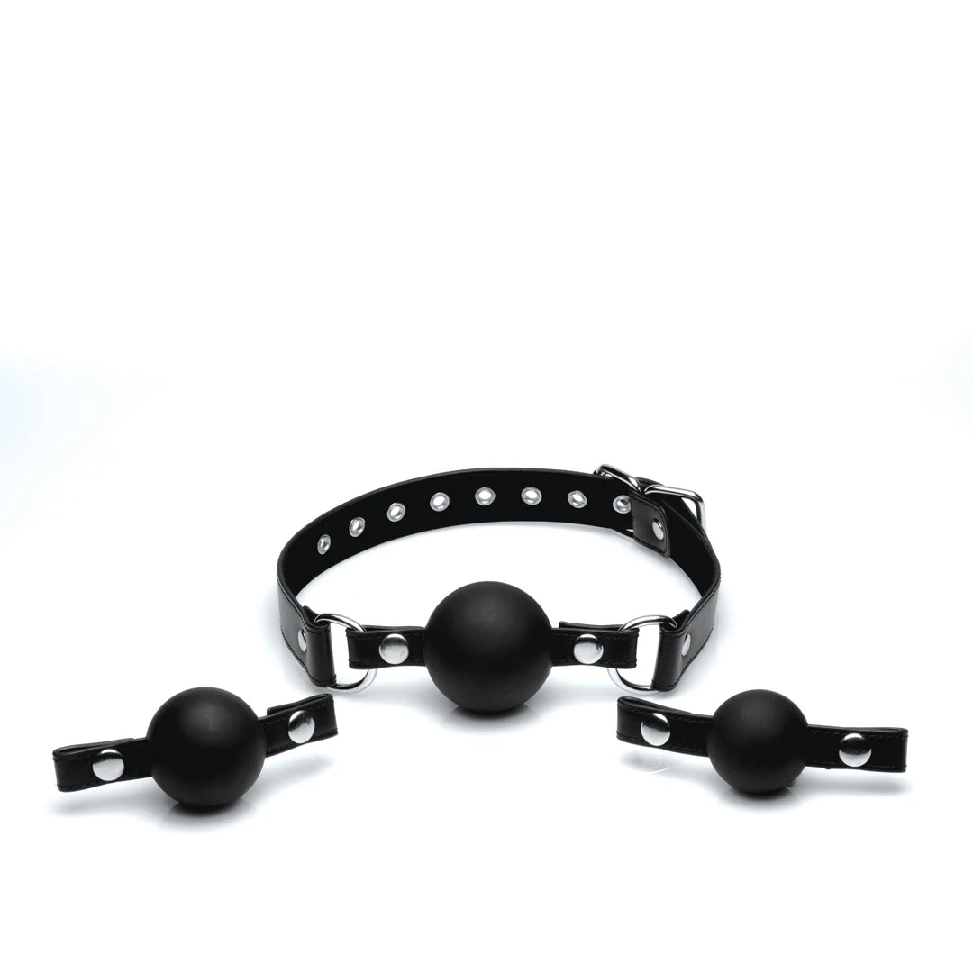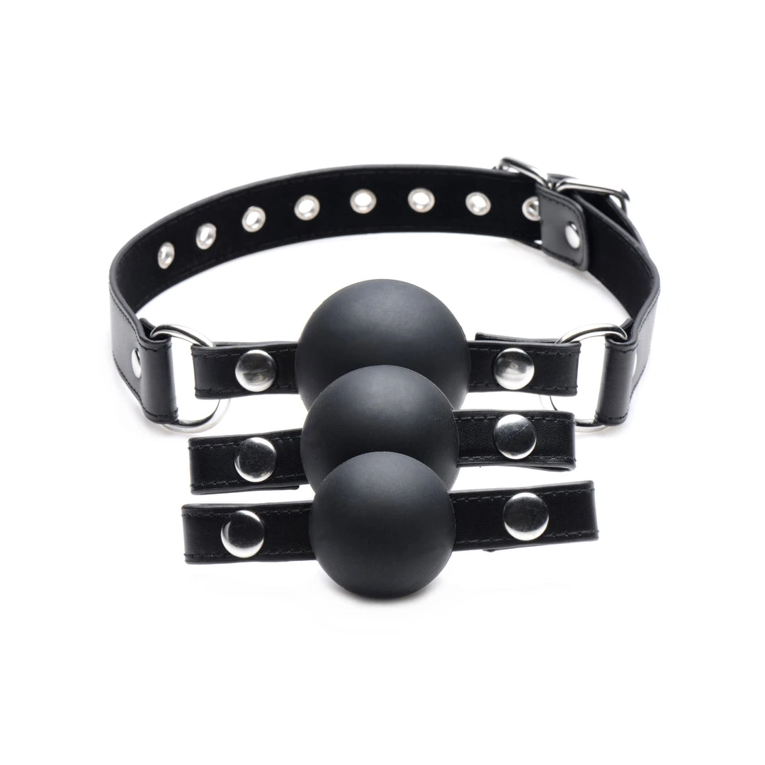 Enjoy more ways to play with a versatile gag set that includes 3 different sized balls. Find the perfect fit or force your playthings mouth open wider and wider, just for fun! Select the size you want and snap the gag into the strap. The ball gag system comes with one strap that adjusts to fit most sizes and buckles at the nape of the neck. Its soft interior feels luxurious and comfortable against supple cheeks. The 3 balls are made of odorless, tasteless silicone and are non-porous for an easy sanitization.