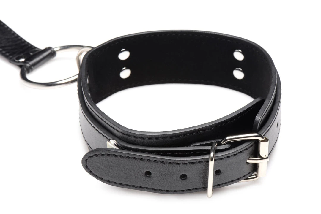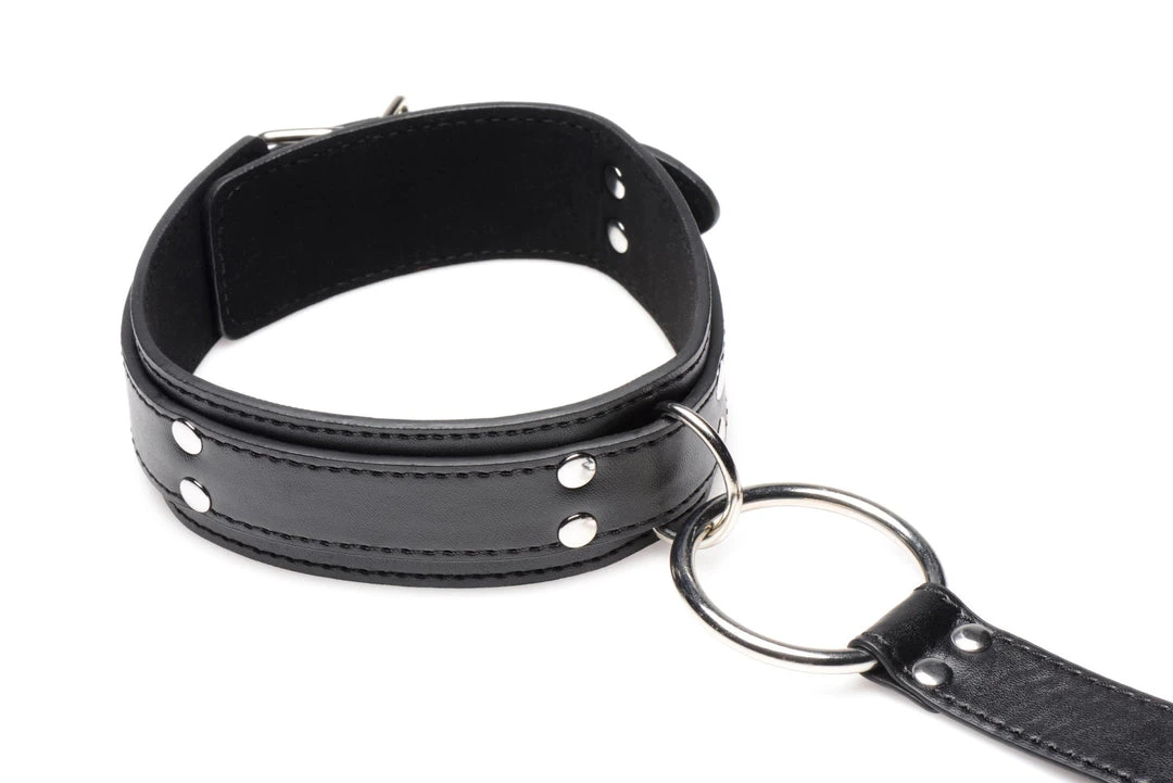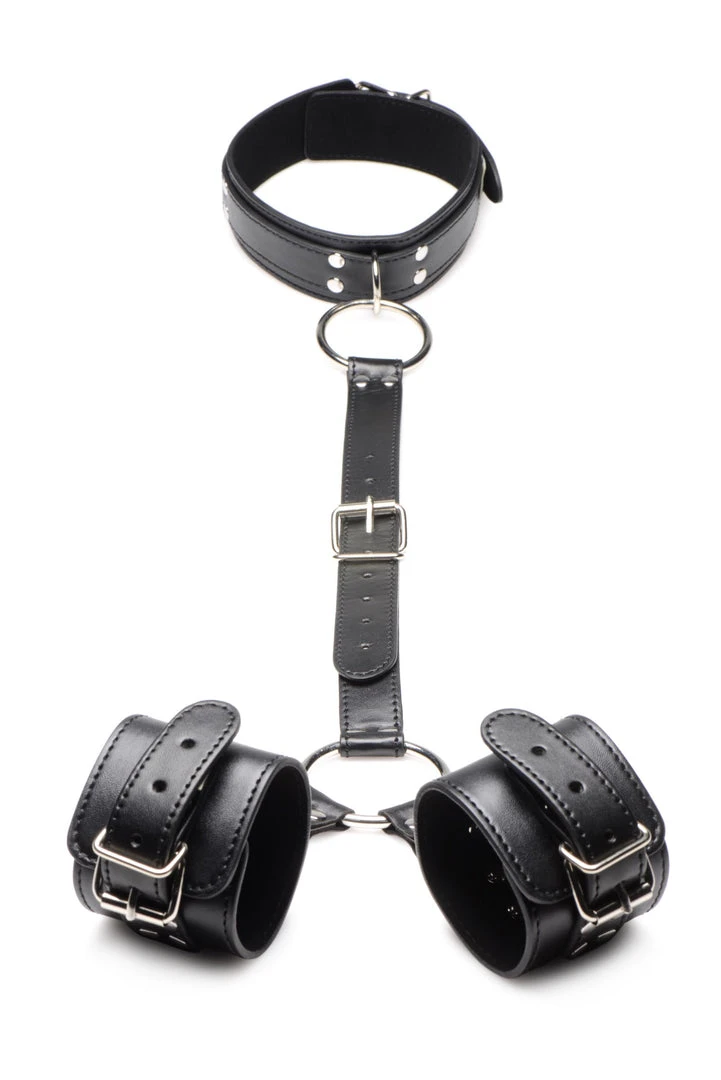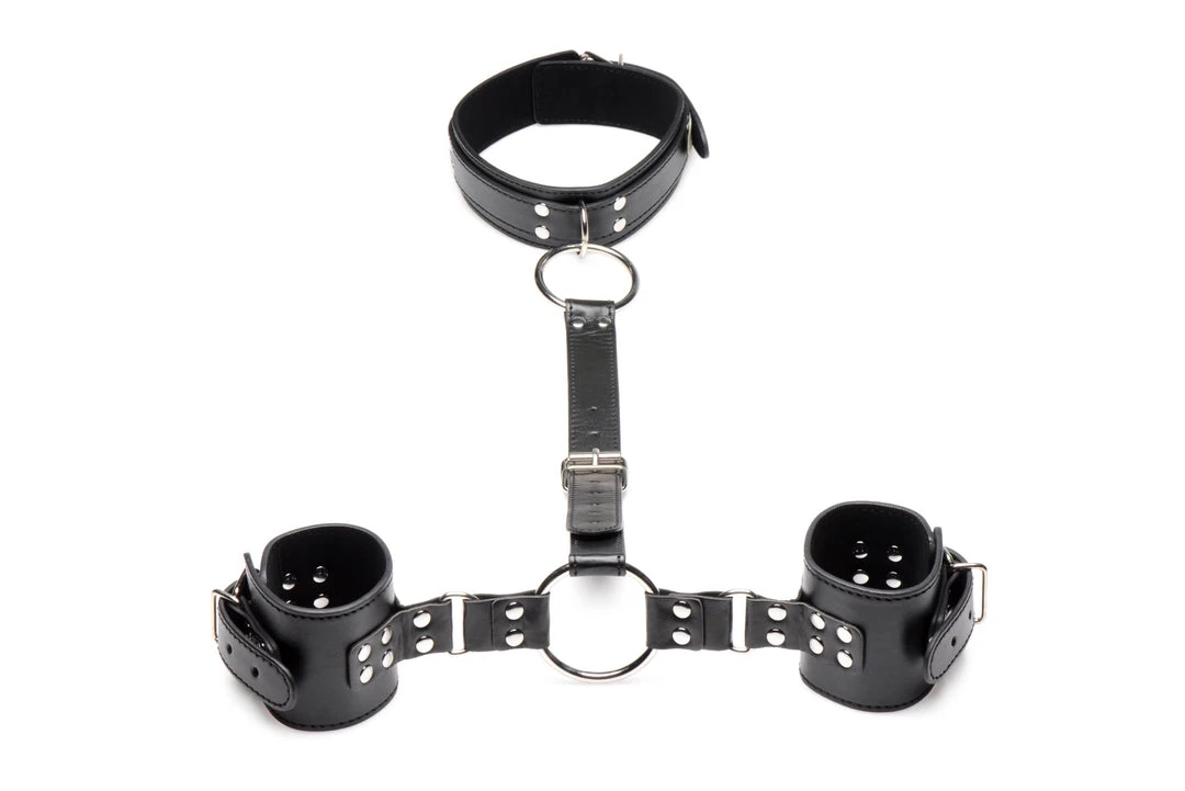 Hook your fingers around the O-rings and tug your lover towards you. Play with attaching the O-rings to different anchor points or place their hands far away from them. Their wrists will be cuffed and restrained, the center strap attached to their collared neck. Keep the center strap short to keep their hands just out of reach of their genitals so they can t play with themselves, and enjoy teasing and toying with them. Limit their movement even more by bringing the strap around to the back and placing their restrained wrists behind their back.