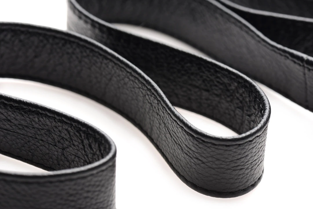 Better than your average bed restraint kit, this luxurious leather set with heavy-duty hardware captures the elegant atmosphere that you crave during your naughtiest private moments. Adjustable to fit any bed size, this system of bondage gear slides under your mattress, while each adjustable strap spreads out and emerges on the sides or head and foot of the bed, depending on how you like to play. Swivel hook clips connect to the D-rings of the sophisticated, leather wrist and ankle cuffs, allowing you to confine your lover in a variety of positions while you have your way with their helpless body!