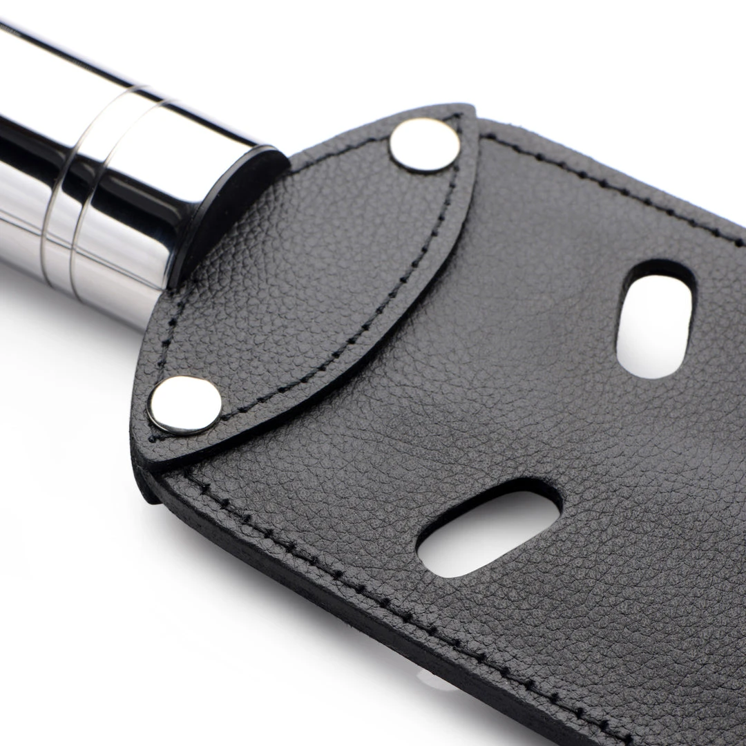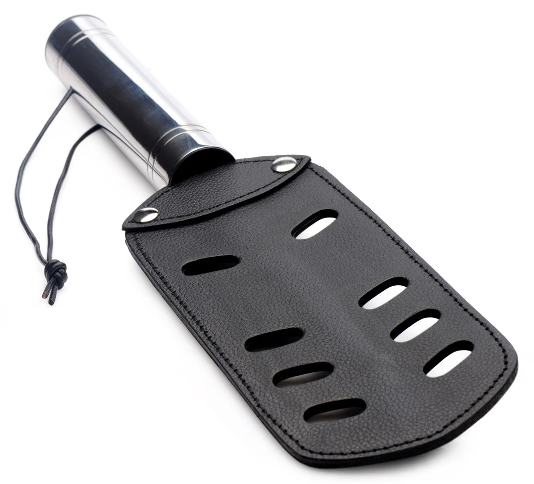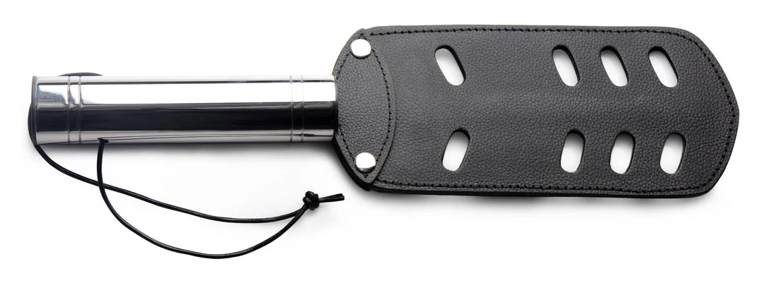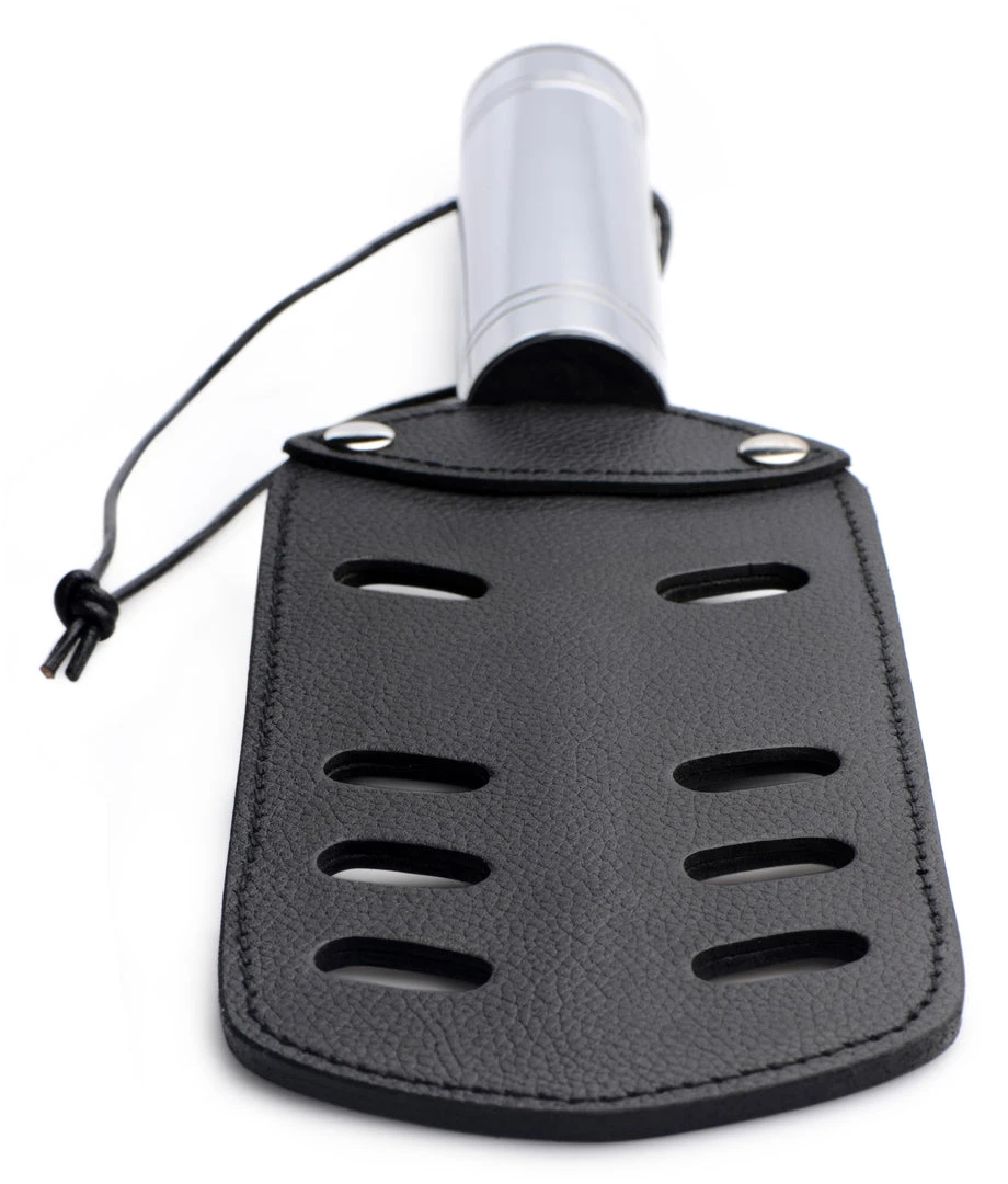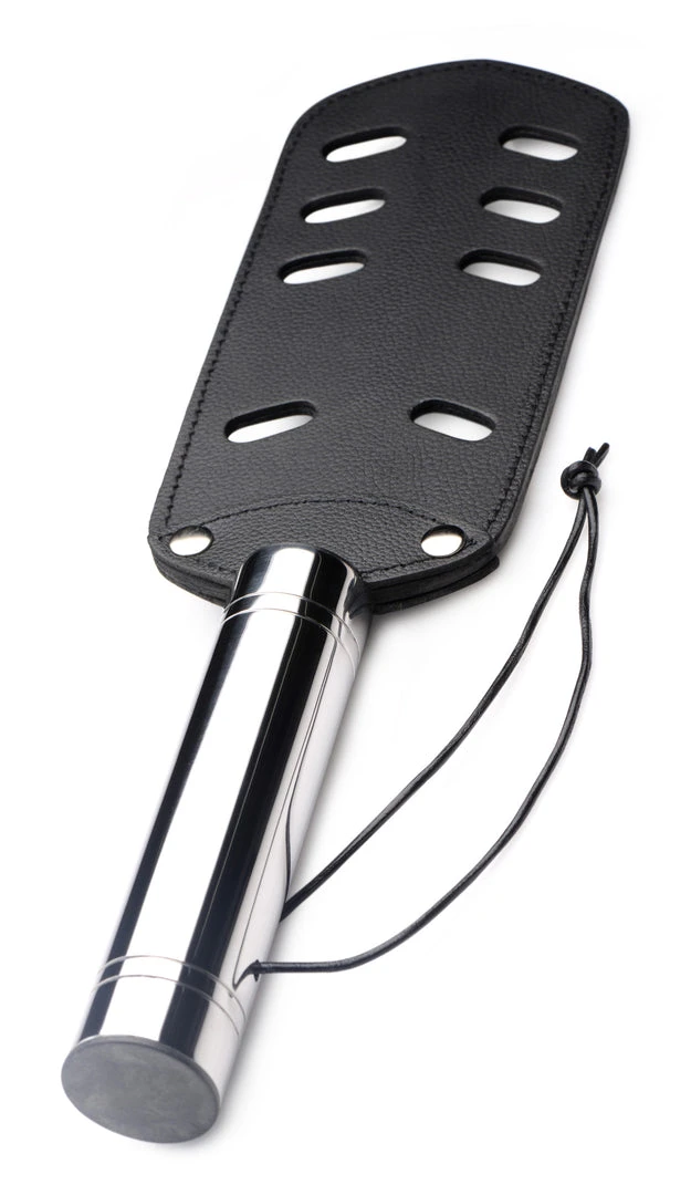 Make an impact with this heavy-duty paddle, featuring holes that allow air to pass through for a more aerodynamic swing. You will be able to hit flesh with more swiftness and power, delivering harder strokes and more painful pleasure. The sturdy, thick leather is no joke! The metal handle adds a cool weight to your control. A loop at the end can be worn around your wrist for more security during use, as well as utilized for hanging storage. Your masochist will fall in love with the intimidating appearance and follow-through of this tool.