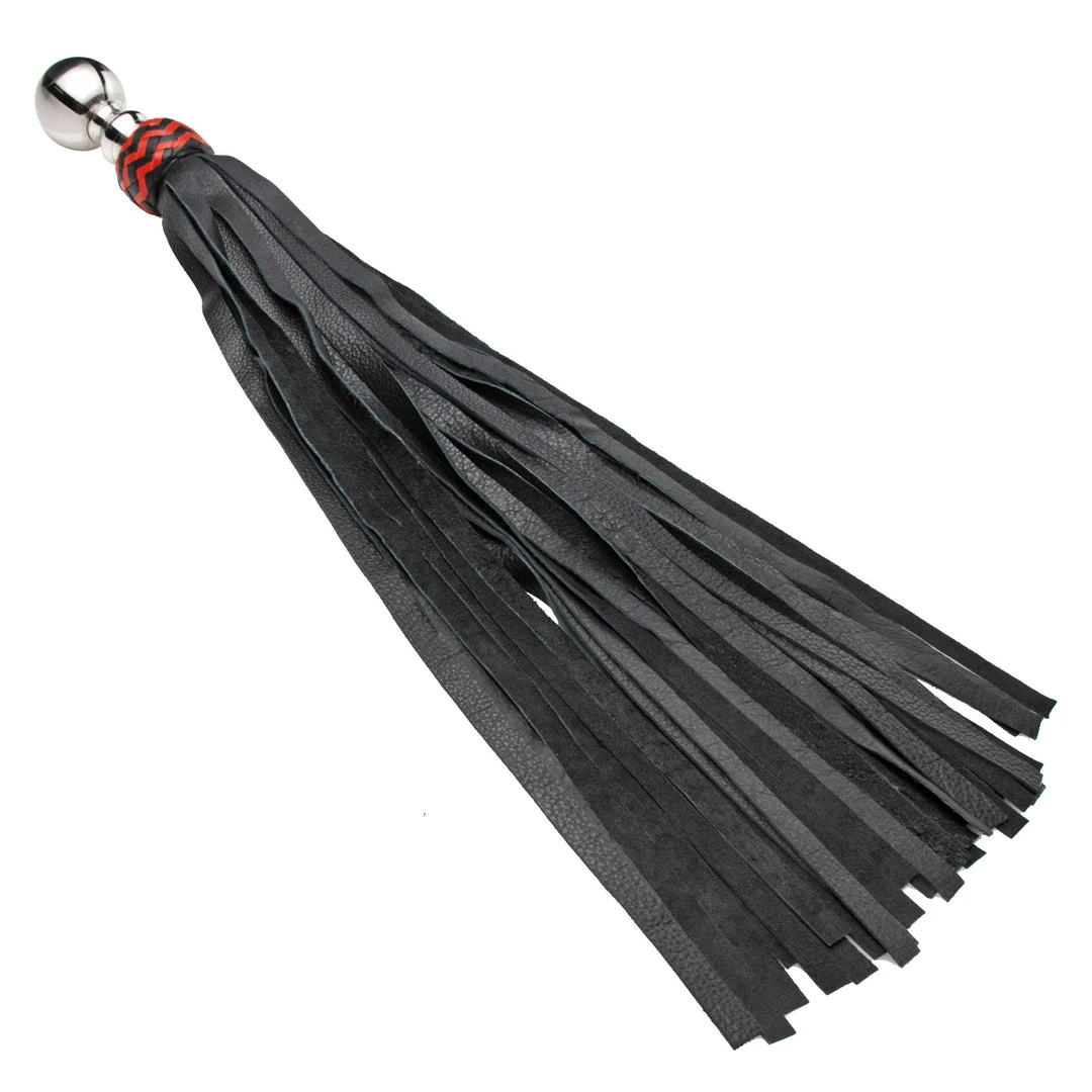 This fine leather flogger has a polished ball handle for more freedom of movement with an elegant design. Made to fit neatly in the palm, the metal handle allows you to swing in wide arcs, so you can choose the type of impact you desire. The high quality leather falls have a prominent grain, with a luxuriously soft yet substantial feel. The ends are flat tipped for a unique sensation, and the entire piece is weighty and made to last.