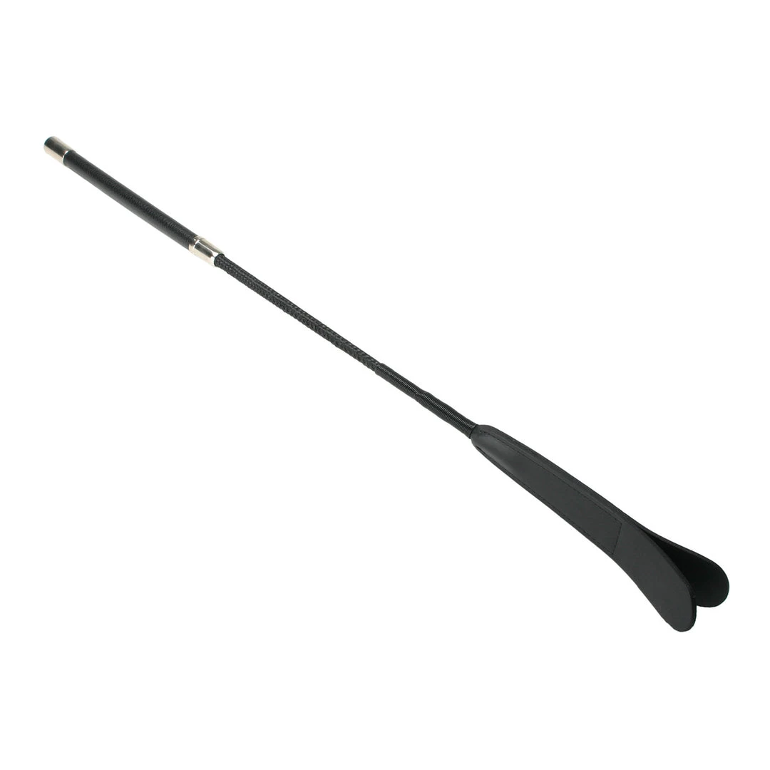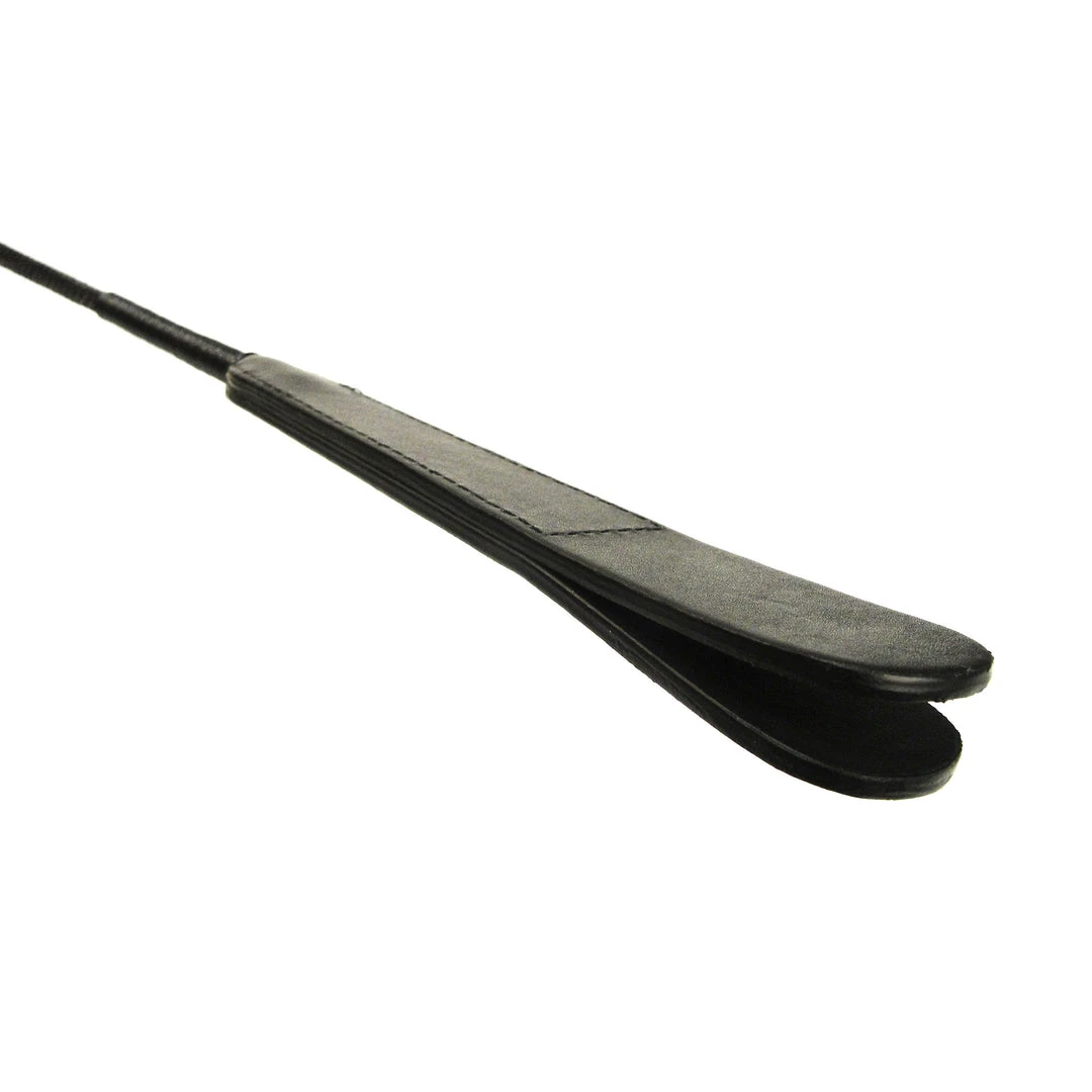 This premium leather riding crop is a fantastic impact tool. The handle is wrapped in a layer of leather with a metal tip. The shaft is rigid, but has a little flex, so on impact the split leather tip provides a nice bite.