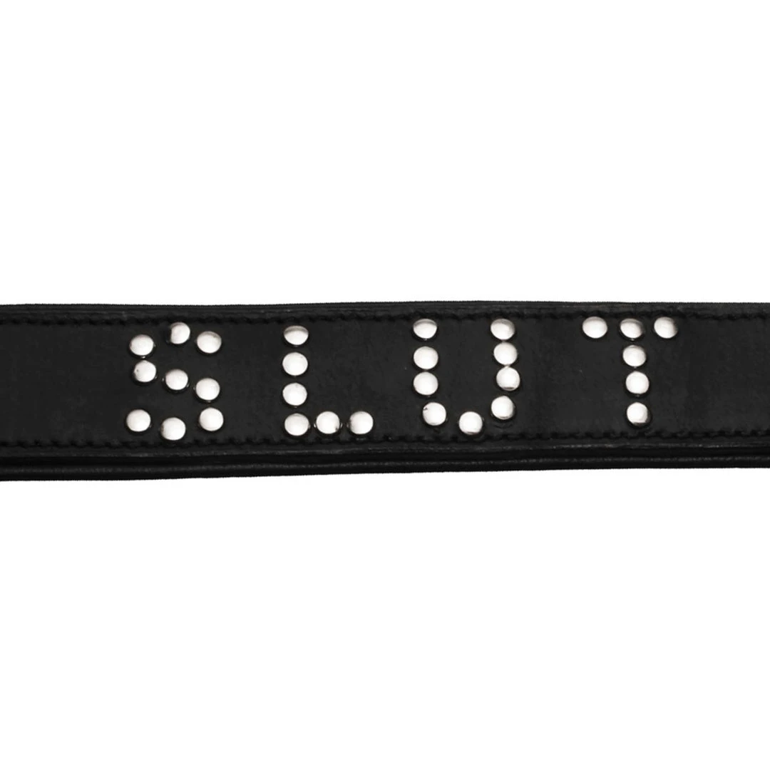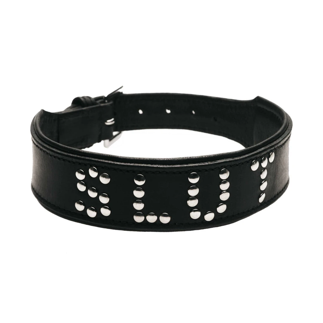 Mark your property or make a statement with this ultra luxe, quality leather collar. The word SLUT is spelled out in shining silver studs, and the double layered leather has an extra layer of padding in the front for comfort. The collar closes in the back with a buckle, and is adjustable to fit necks between 14.5 and 17.25 inches.