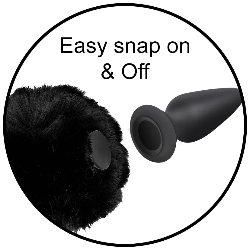 This little black bunny tail fits perfect on a SnapOn Tailz silicone anal plug! Let your sultry and seductive side show as you show off your dark desires. Wear it with matching lingerie and accessories to really set the scene and explore how many ways you can make your partner hip-hoppin happy! The SnapOn base is made of ABS plastic. The soft, bunny tail is made of vegan friendly polyester. Spot clean as needed using mild soap and water.