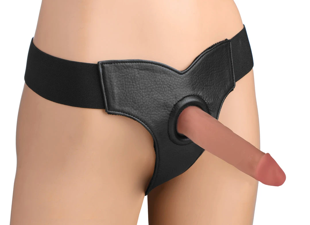 Simple and sexy, the Bailey Harness makes strap-on play easily accessible when the mood strikes. Just slip a dildo into the hole cut-out, reinforced with a silicone O-ring within, then slip the stretchy waistband up your hips. The wide elastic band has enough stretch to fit a variety of sizes, while maintaining stability during vigorous thrusting. The soft, sensual velvet interior of the harness is luxurious for the wearers satisfaction, while the exterior is made of elegant vegan leather. This strap-on harness is machine-washable.