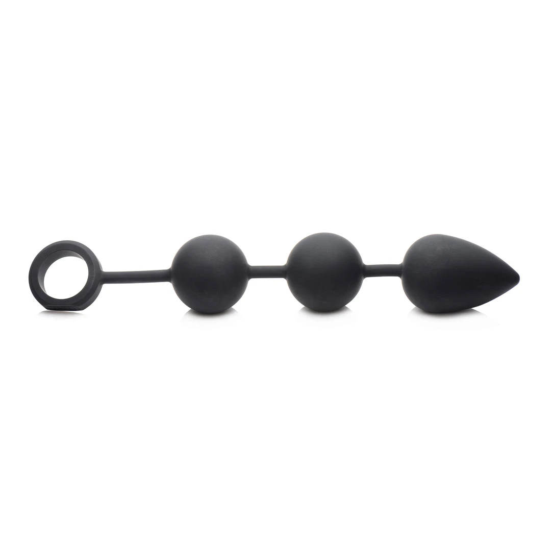 Explore a new level of anal pleasure with these unique anal beads that are not just huge, but heavy! These massive anal balls are internally weighted, with a silicone skin and convenient retrieval cord. The steel balls inside provide weight and resistance, while the silicone exterior provides a silky-smooth feeling. The first bulb features a tapered tip to make insertion more comfortable. The easy-retrieval cord has a large finger loop, also made of sturdy silicone, to tug these hefty spheres out at just the right time. The entire outside is non-porous, phthalate-free, and body-safe. Clean after use with mild soap or toy cleaner and avoid use with silicone lubricants.