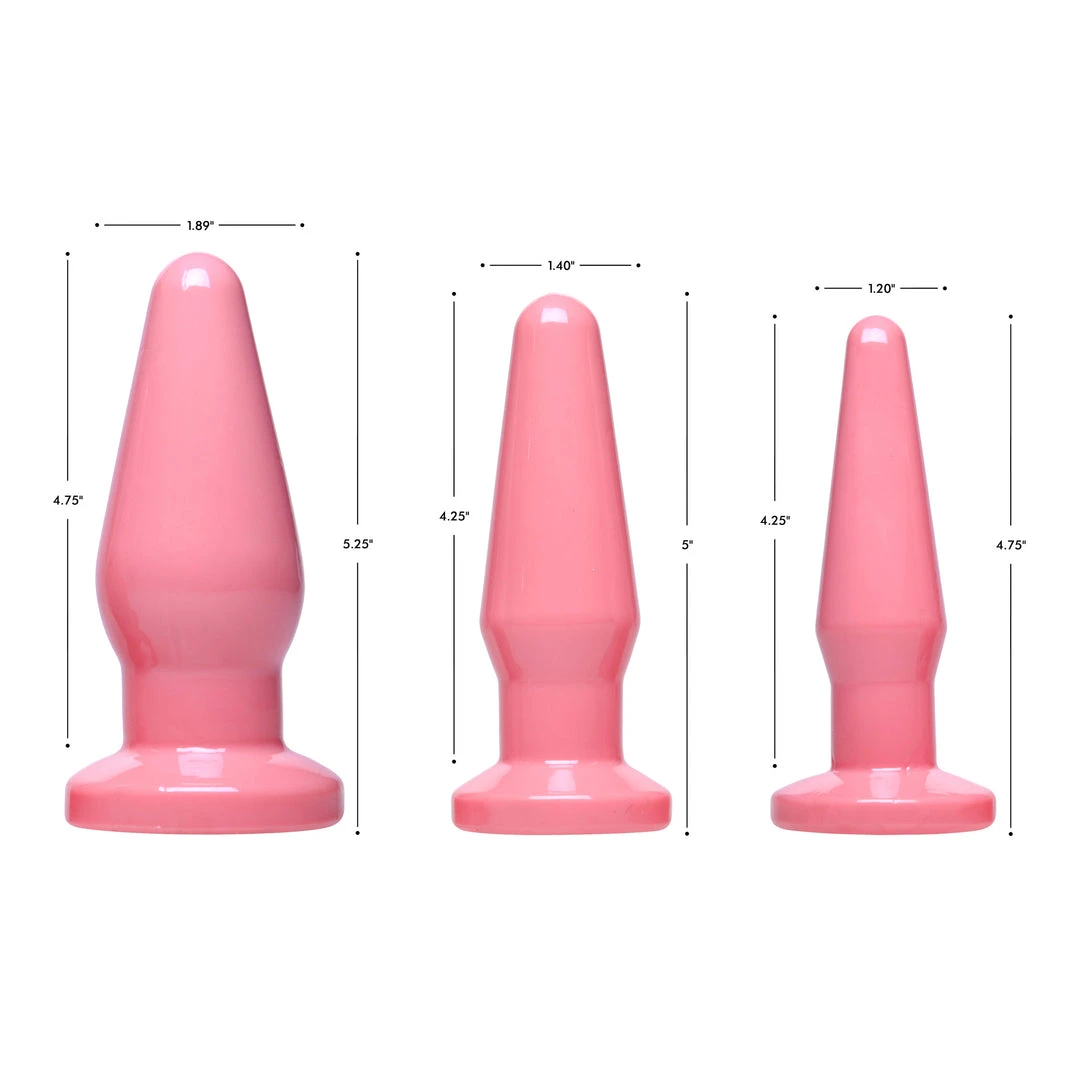 Whether you are a beginner or expert, you will fall in love with these Pink Anal Plugs! Each is soft and flexible, giving you lots of pleasure while in use. At the bottom, the base flares out, helping the entire plug from going in. If you are new to anal play, you can start of with the small plug. It is short and not very wide, making it a easy and pleasurable first experience. Each plug is made from TPE.