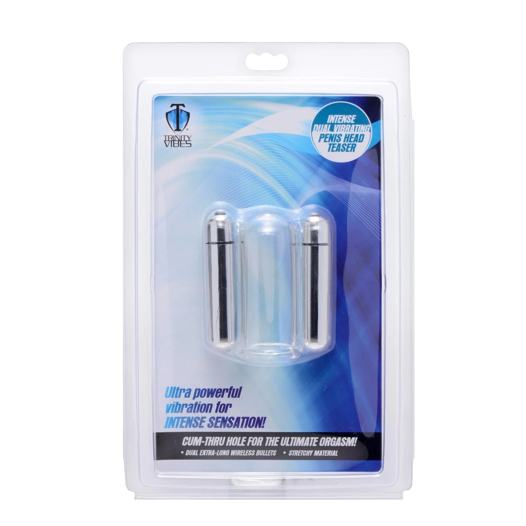 This clear sheath allows you to watch your penis head thrum! With super-powered twin vibrating bullets and a super-stretchy, head-encompassing sleeve, you can experience targeted stimulation on one of the most sensitive areas of your body! Two ultra powerful wireless bullets help surround the tip of your cock in toe-curling pleasure. Designed to fit most any size, the slick material helps keep the bullets firmly against your helmet, while transmitting the vibration to every part of your cock head. A cum-through hole allows for the ultimate orgasm. Just slip it on and go!