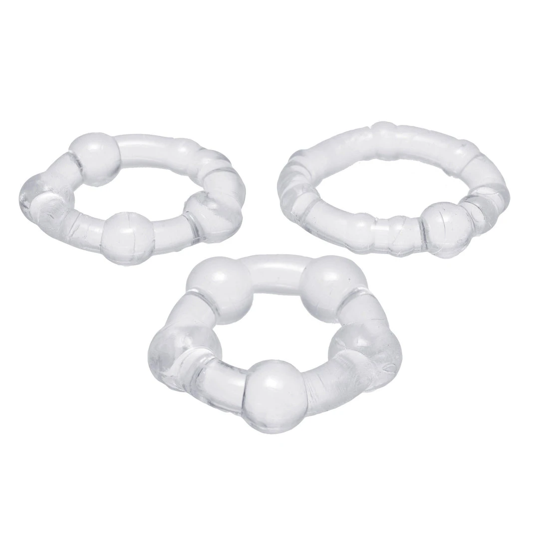 Show your partner how hard you can be and how long you can go with these Performance Erection Rings. Unlike most cock rings, they are able to stretch out and fit just about any sized man for a more comfortable fit. Not to mention making it easier to put them on and to take off. Each ring has a unique set of bumps for added stimulation while wearing. Each set includes three penis rings, each a different size and pattern.