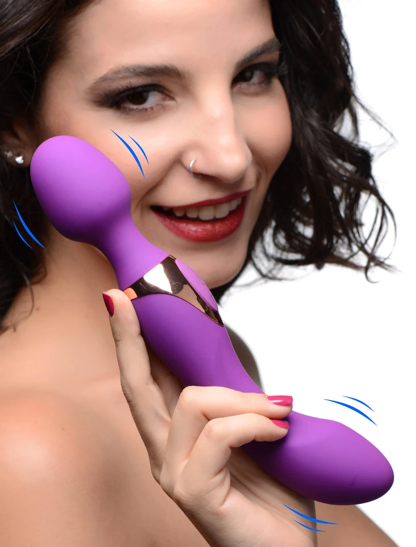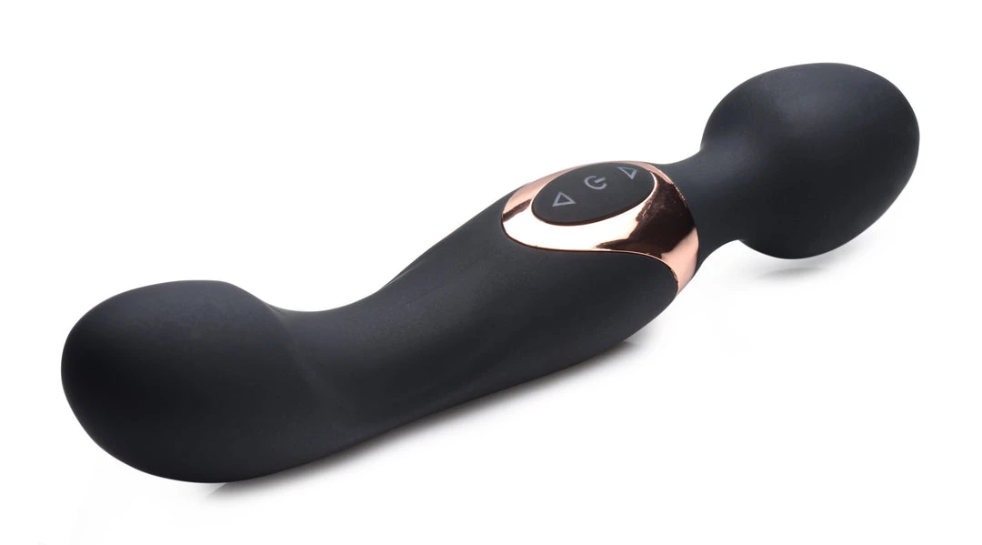 Enjoy both ends of this classy 2 in 1 silicone massage wand! This double ended vibrator comes with a classic massage head with a flexible neck on one end, and a deliciously curved silky smooth vibrating handle for a wider contact area and penetration possibilities!