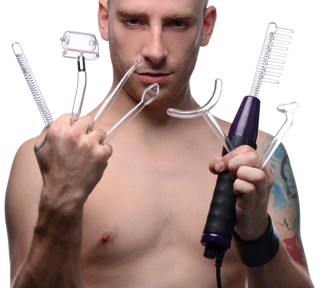 Expand your Violet Wand play with 7 electrically erotic accessories! Light up your love life with a sensual and stimulating light show as you hover and glide the glowing attachments over the most sensitive areas of the body. Each of the seven pieces of this kit plug into your Zeus Twilight Violet Wand, sold separately, to send sizzling sensation onto your sensitive skin in exciting new ways. The massage roller provides a light and seductive massage, while the condenser comb and the wand offer more intense stimulation. The curved Y contours curved areas such as breasts, buttocks, legs, or throat. Also included are the traditional ball tip probe, tongue, and mushroom attachments for pin-pointed pleasure. Experience the subtle shock of electrosex that these accessories have to offer!